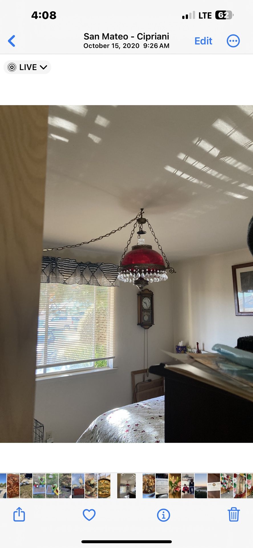 Antique ruby red glass hanging parlor lamp with crystal prisms