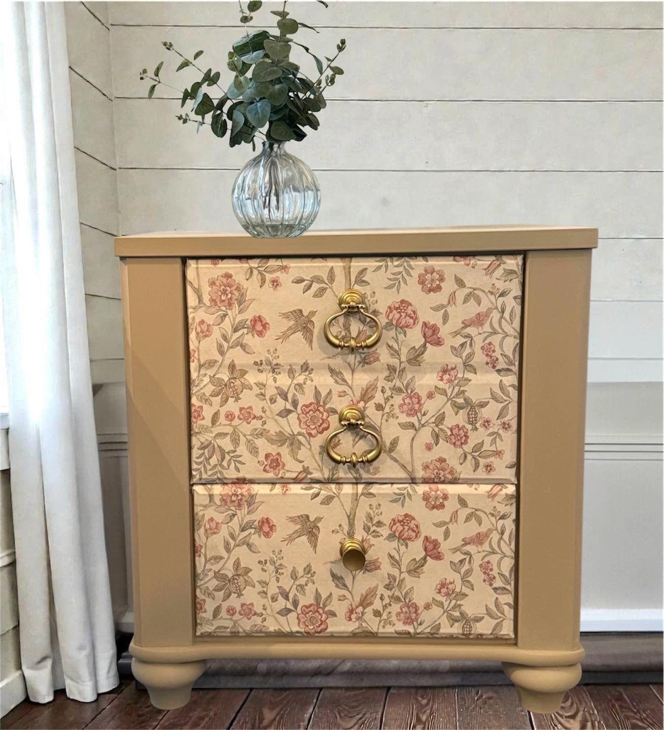 LARGE NIGHTSTAND $125 This Large, Single nightstand by Ashley Furniture , Refinished in a warm neutral tones will add something extra to your room. It has 2 Large drawers covered in a beautiful floral paper and accented with gold hardware. Large Bun feet give some extra height and the top has a textured finish. Heavy, quality piece. Measures 24” wide 26” tall 16” deep Cash and Venmo accepted Message me for details Pick up off Woodman Drive in Dayton