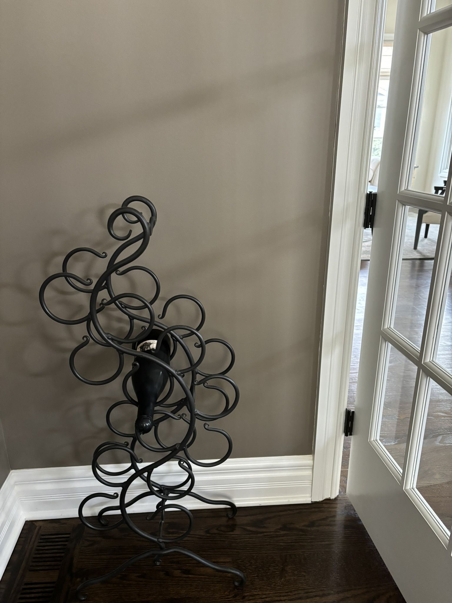 Beautiful Metal wine rack. Holds 12 bottles of wine. Sturdy rid iron .