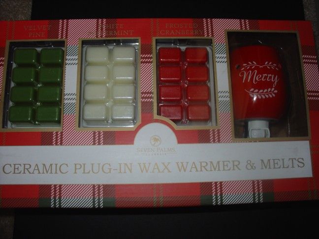 NEW IN BOX MERRY CERAMIC PLUG IN WAX RED WARMER WITH 24 MELTS. CHRISTMAS GIFT SET! 8 WAX CUBES OF EACH SCENT/COLOR. RED/GREEN/WHITE INCLUDED. SCENTS ARE VELVET PINE, WHITE PEPPERMINT, FROSTED CRANBERRY. SEE PHOTOS. MADE BY SEVEN PALMS. A GREAT SET OR GIVE AS A GIFT FOR CHRISTMAS! Located in NW Hillsboro CASH ONLY - PICK UP ONLY I WILL NOT TEXT OR CALL, WILL ONLY REPLY TO MESSAGES