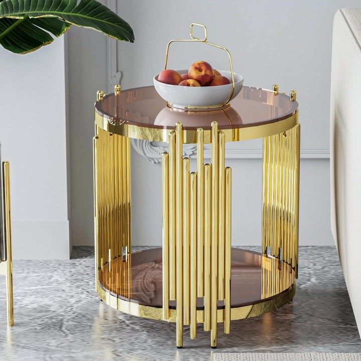 Round Gold End Table, Brown Tempered Glass Side Table Modern Luxury Living Room Table Stainless Steel Irregular Leg, Small Coffee Tables for Home Office,Brown