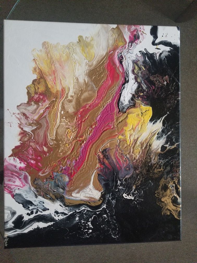 16 by 20. Dutch pour technique. Some texture, a little shine. In the black part of painting I did it so it comes out sort of as a dragons head.