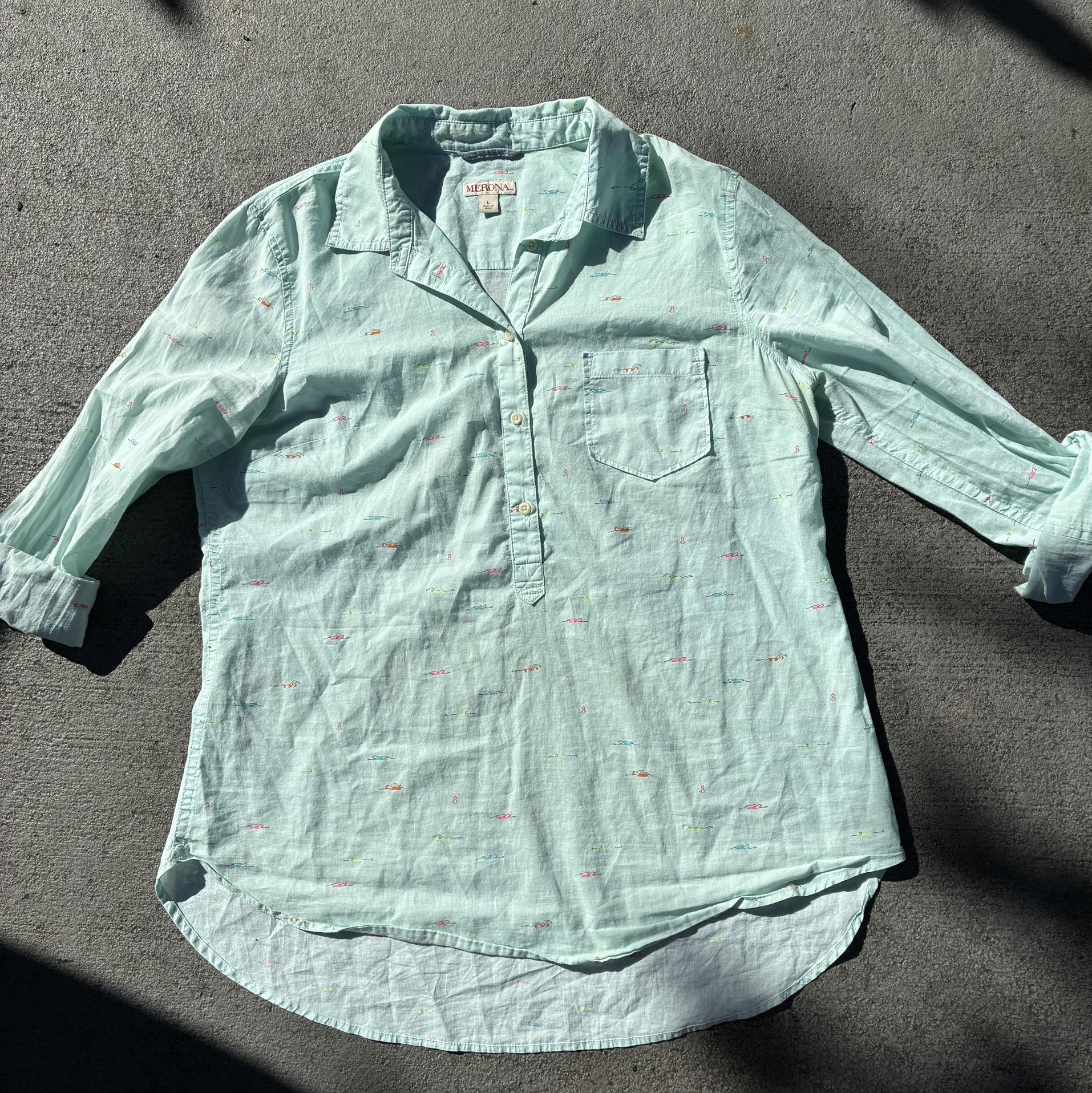Light green button down shirt. Features subtle embroidered details. Perfect for casual wear. Make sure you bundle it!