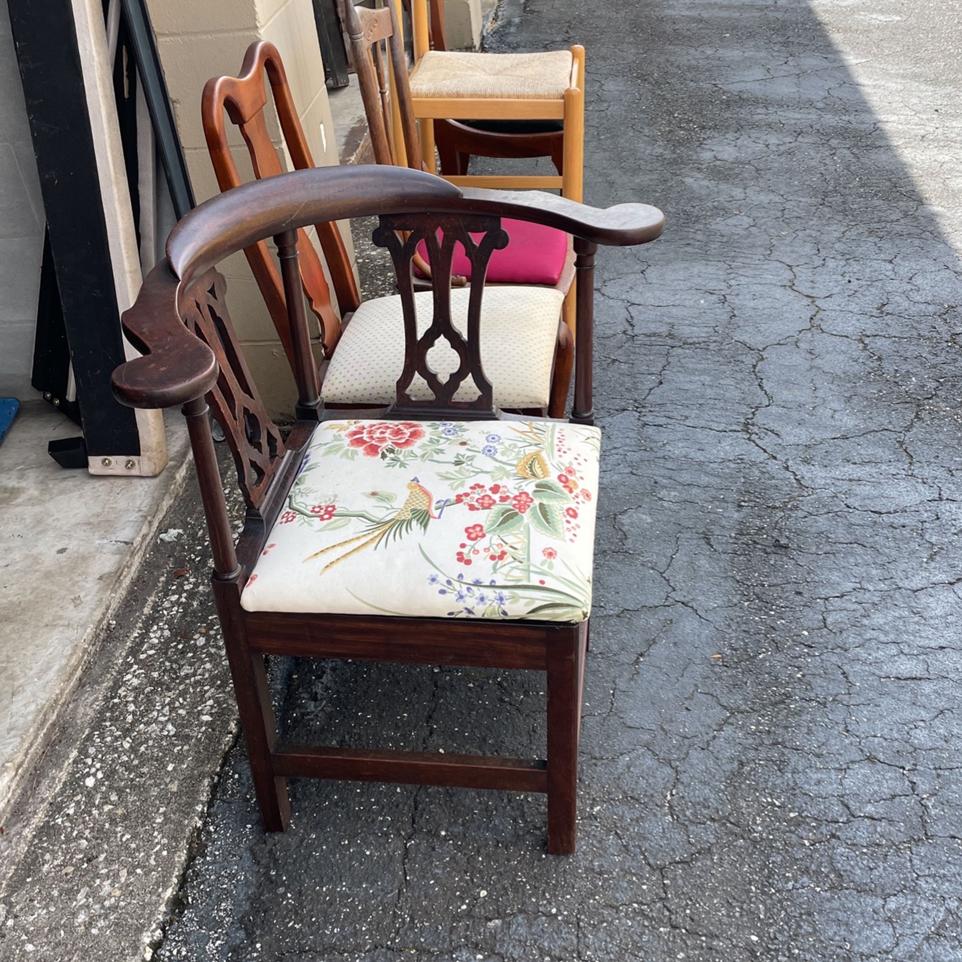Horse chair is an antique real nice shape for its age 1940s $35 nice chair for underneath the table $25. That is number two solid wood chair with pink top $25. That’s number three solid wood barstool. 24 inches in heights $30 number four nice antique chair 1940s with flowers in real good shape $35. That’s number five any questions get in touch with me.