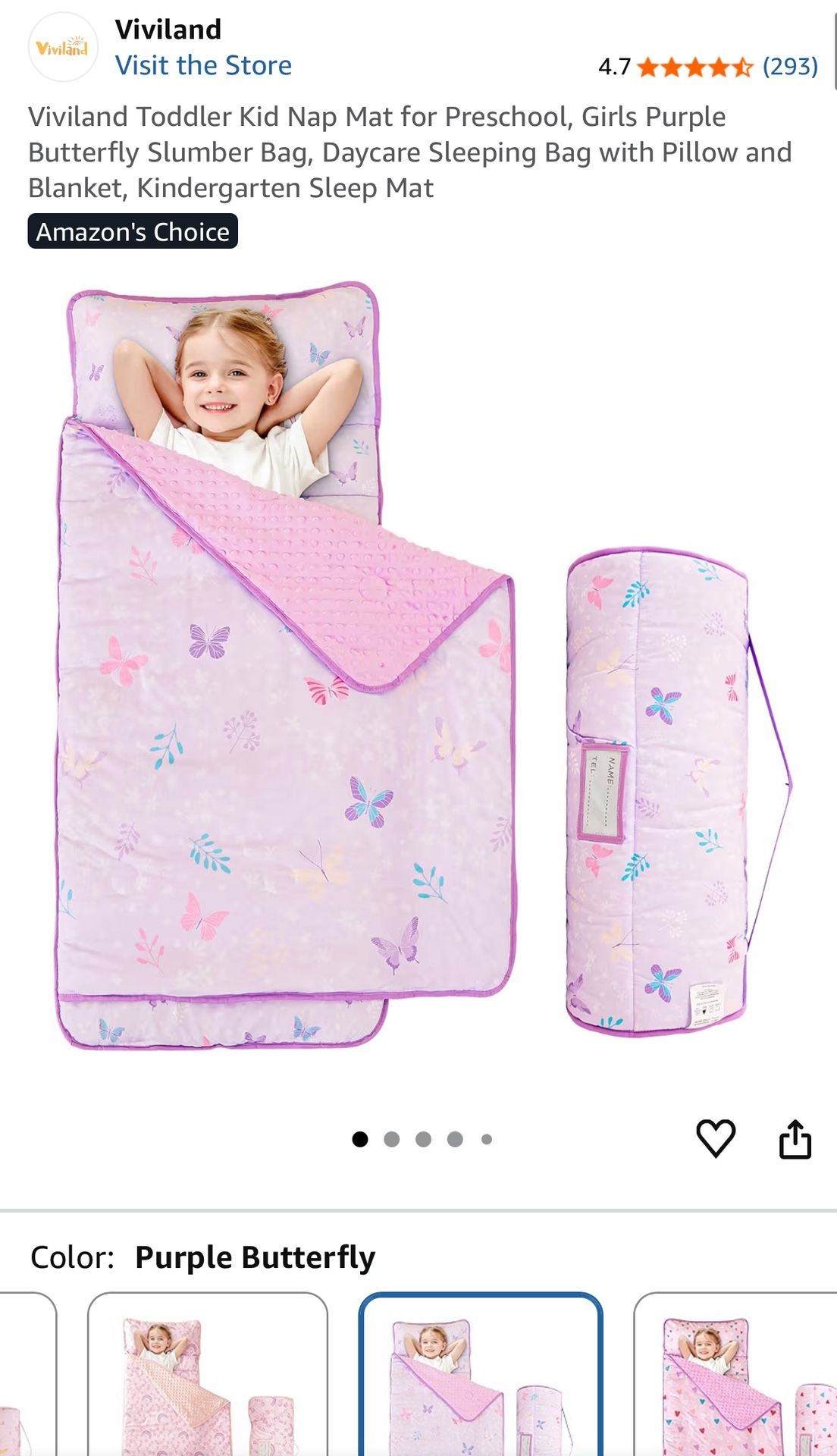 NEW!!! Viviland Toddler Kid Nap Mat for Preschool, Girls Purple Butterfly Slumber Bag, Daycare Sleeping Bag with Pillow and Blanket, Kindergarten Sleep Mat *** Product Details*** Material : brushed microfiber Color : Purple Butterfly Brand : Viviland Water Resistance Level : Not Water Resistant Item Weight : 1.14 Kilograms Microfiber Imported Cozy Sleeping Solution: Give your little girl a comfortable and warm sleeping environment with Viviland's movable kids bed- A purple toddlers nap mat with a removable blanket and pillow in a charming butterfly design Versatile and Fun: Girls purple butterfly slumber bag is perfect for preschool nap time, daycare, kindergarten, sleepovers, camping, and other outdoor adventures- this multi-role nap mat/sleeping bag is loved by toddlers kids everywhere Easy to Roll and Carry: With hook and loop closures and handles, your girl can easily open, roll up, and transport their nap mat/sleep mat wherever they go; plus, the built-in name tag of the girl's slumber bag helps with identification The Right Size: Sized at 50"*20" with a 41"*32" blanket, this girls purple butterfly kindergarten nap mat/ slumber bag with a removable pillow and blanket is ideal for kids aged 3-6, ensuring a comfortable and snug fit Simple Care Instructions: Keep things easy and low-stress with this machine washable toddlers sleeping mat/napping mat, just remember to remove the insert pillow before washing and always use cold water on low heat