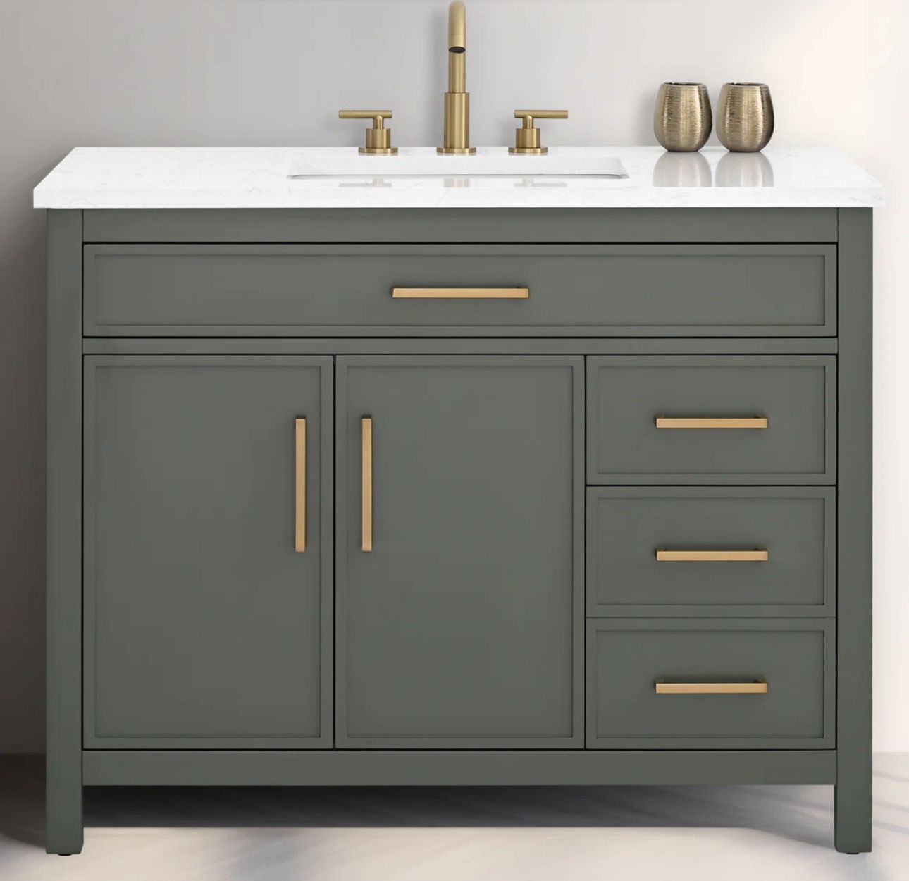 Beautiful bathroom vanity. Gold pulls. Faucet NOT included. See photo for measurements. Please note: there is a scratch on the top of the marble. I have included a photo. In I’m ex cfu on