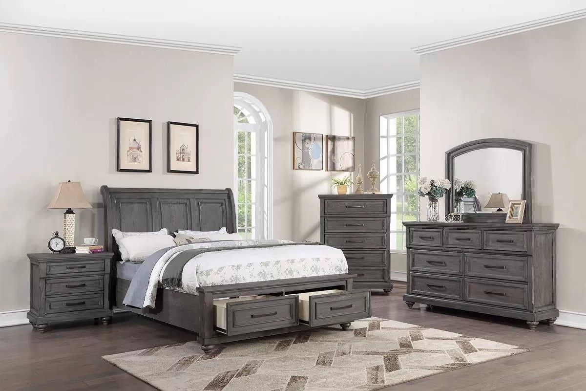 Brand New Rustic Weathered Gray 4pc Queen Size Storage Bedroom Set