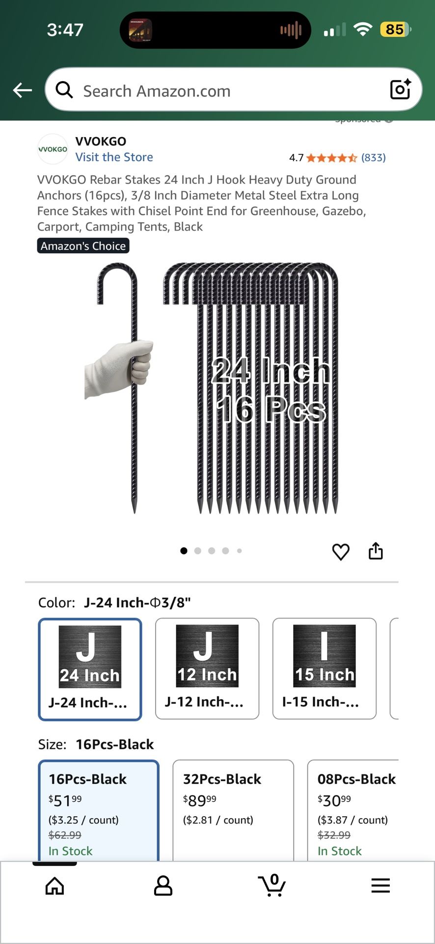 New in box VVOKGO Rebar Stakes 24 Inch J Hook Heavy Duty Ground Anchors (16pcs), 3/8 Inch Diameter Metal Steel Extra Long Fence Stakes with Chisel Point End for Greenhouse, Gazebo, Carport, Camping Tents, Black