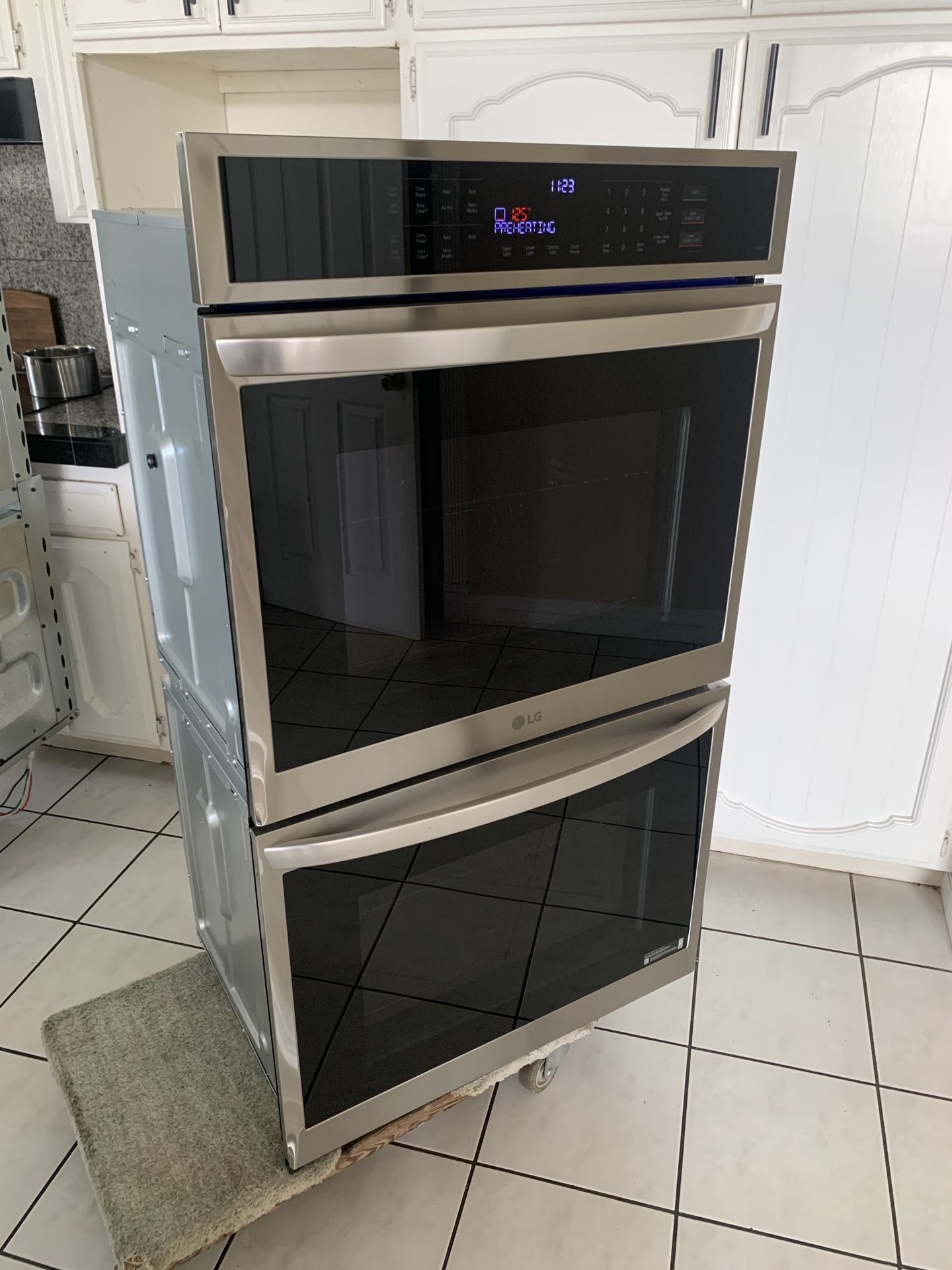 Purchased the wrong size (I needed 27”) and I unfortunately dented it a little in transport and was unable to return. See last pics, small dents on lower left hand side of door. Other than the minor cosmetic, it’s new and working great. Cost $2,300… my loss ur gain, selling for $800. Model: WDEP9423F LG Smart Double Wall Oven with Convection and Air Fry WDEP9423F