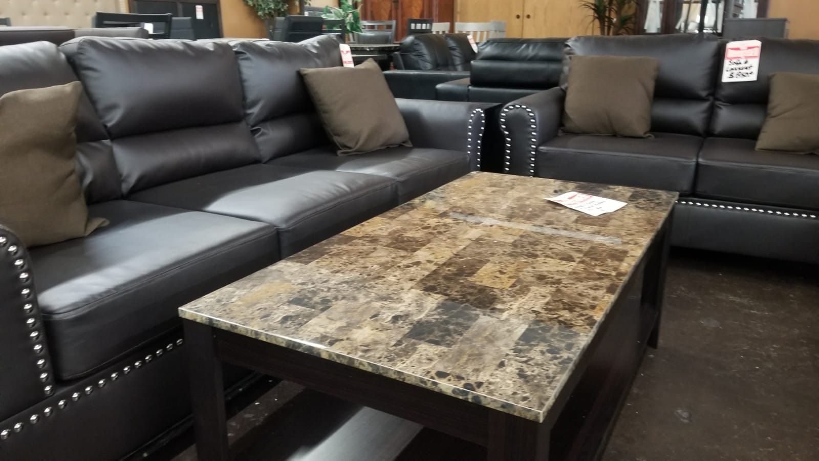 Dark brown faux leather sofa and loveseat with pinheads