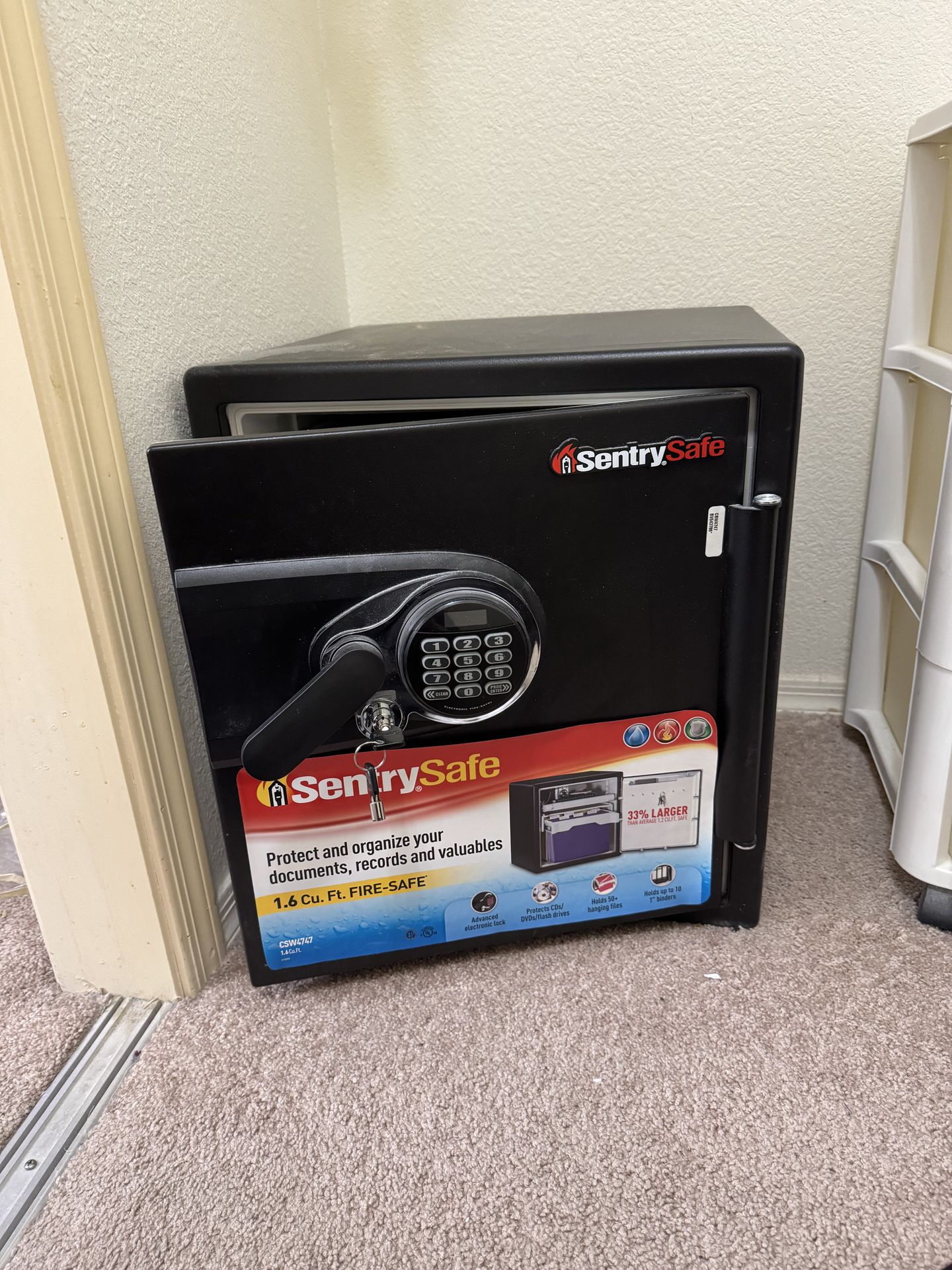 Floor mounted Sentry Safe. I have keys and combination, Very heavy, you may need a dolly and you will have to remove bolts/hardware so bring your sockets/wrench