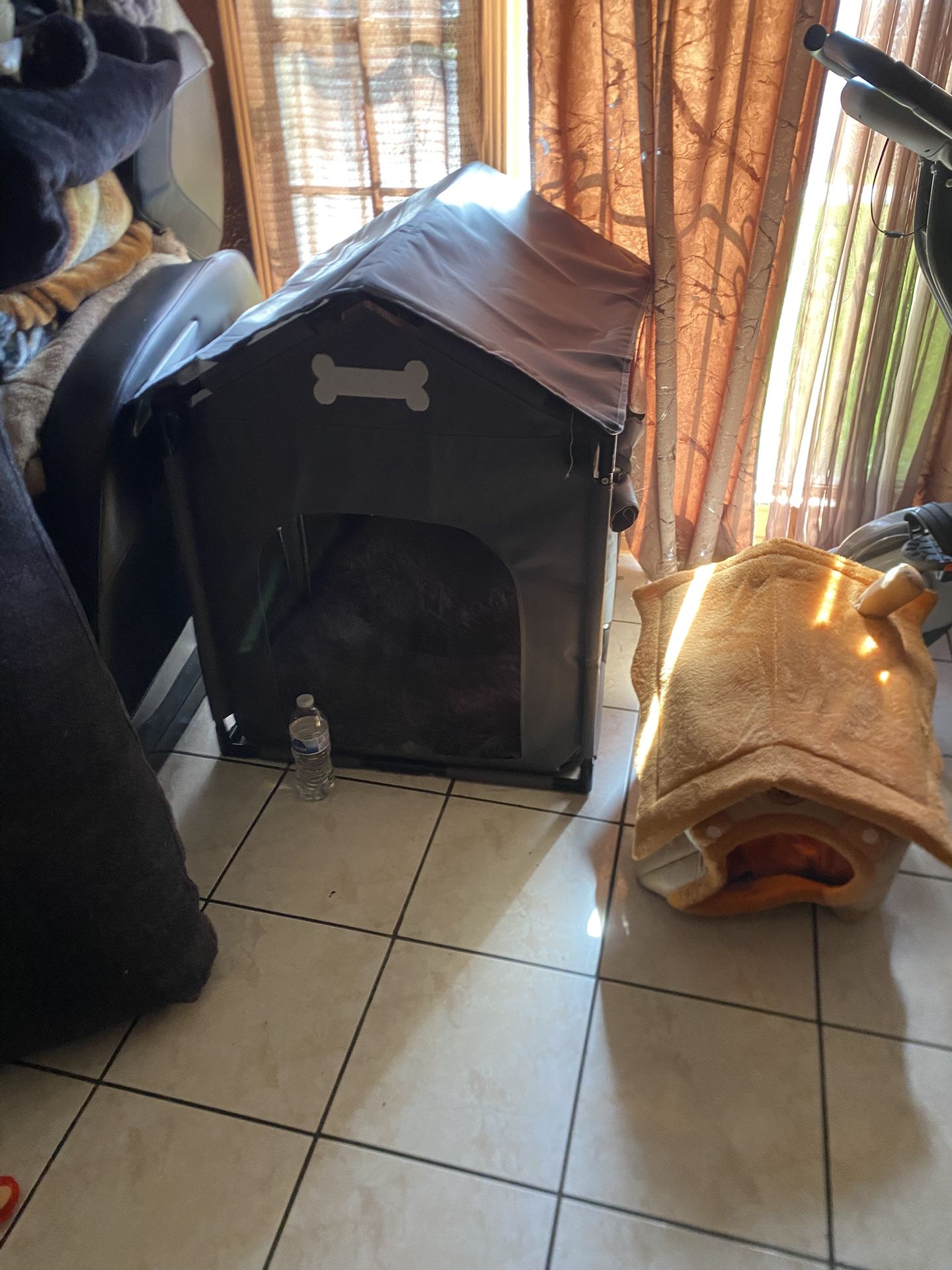 I bought a dog house off TikTok and my dog doesn’t even use it. Now I have less space in my living room I paid $70 but I’m asking $60 . It has never been used , comes with 4 windows and covers to cover the windows. A huge comfy pillow for your fur baby to sleep on. I have the water bottle in the photo to show you the size of the house. It’s easy to pick up not really heavy. Lmk