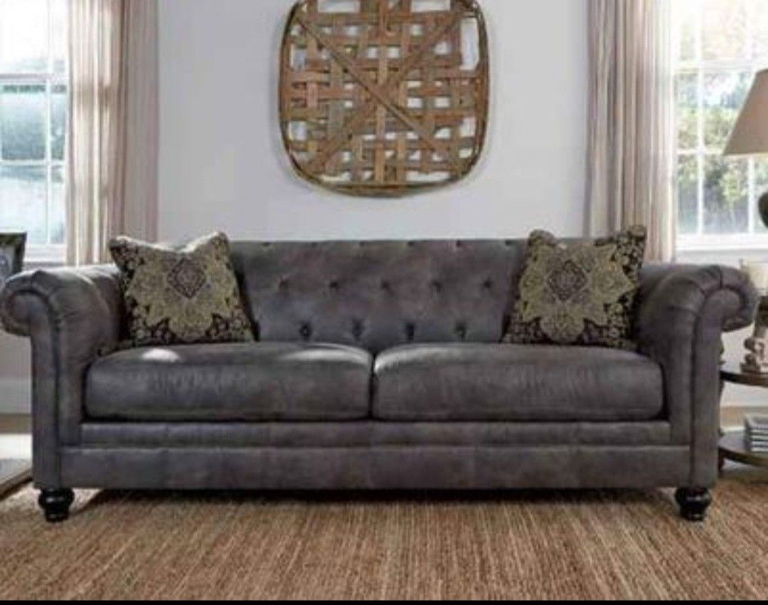 Sat on once before move and placed in storage. Virtually new. No stains, smells, etc. Cool tufted faux leather cloth. See photos. Sofa 91"w x 40"d x 36"h Loveseat 61"w x 40"d x 36"h Retail ~$1100. Make me an offer!