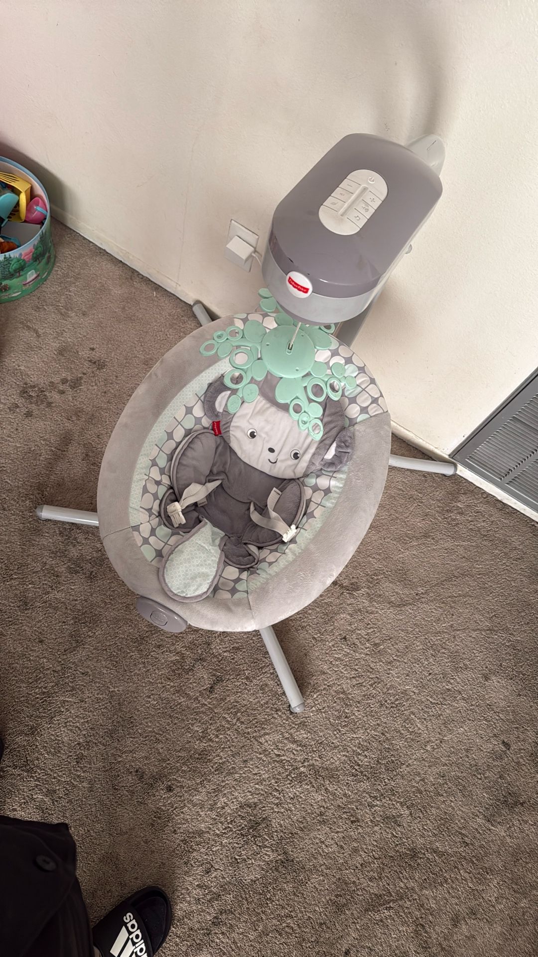 Fisher-Price Sweet Surroundings 12.25-in Teal and Gray Upholstered Kids Rocking Chair Item #1865216 | Model #155902 *Everything works. Only thing is that when I bought the swing, it was missing a bolt, so I put my own. Not a perfect fit but it is perfectly fine. Also missing the little teddy bears.