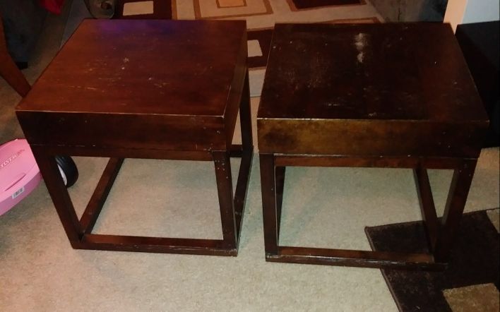 2 cubed coffee/end tables. Some scratches on top surface as shown in pictures. Can be covered with a mat or table runner. Please see other offers. Thanks