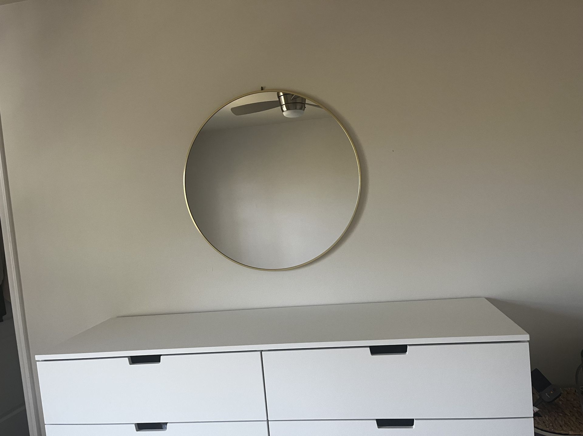 Round mirror with gold trim 30” diameter. Like new condition (recently purchased), comes with original box for easy/safe transport