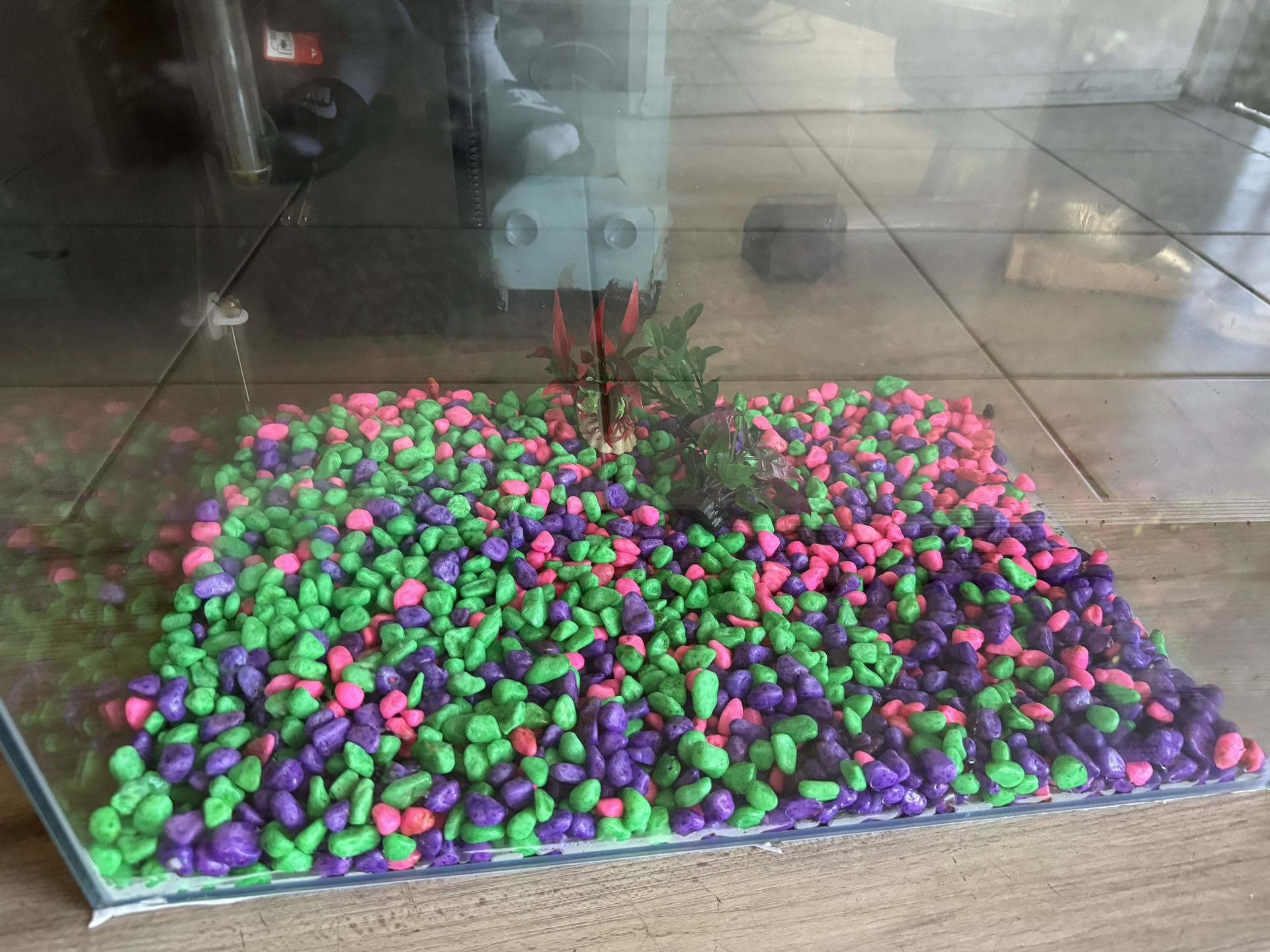 15 gallons Pink and green pebbles Artificial plants Water heater Thermometer Includes lid to tank