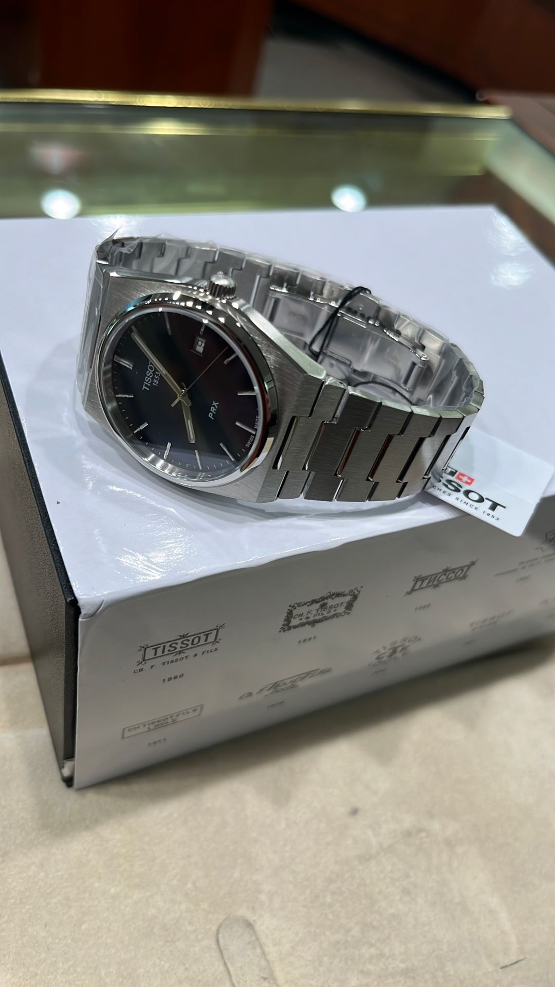 Unworn, unused Tissot PRX. Very desirable model, a YouTube darling. Buy it for yourself before someone else does. You are getting an open box discount. Watch retails at $415. Its in PERFECT condition with the plastic for you to remove yourself ! Free sizing for local buyers, or send in your wrist measurement and I will send you the watch sized.