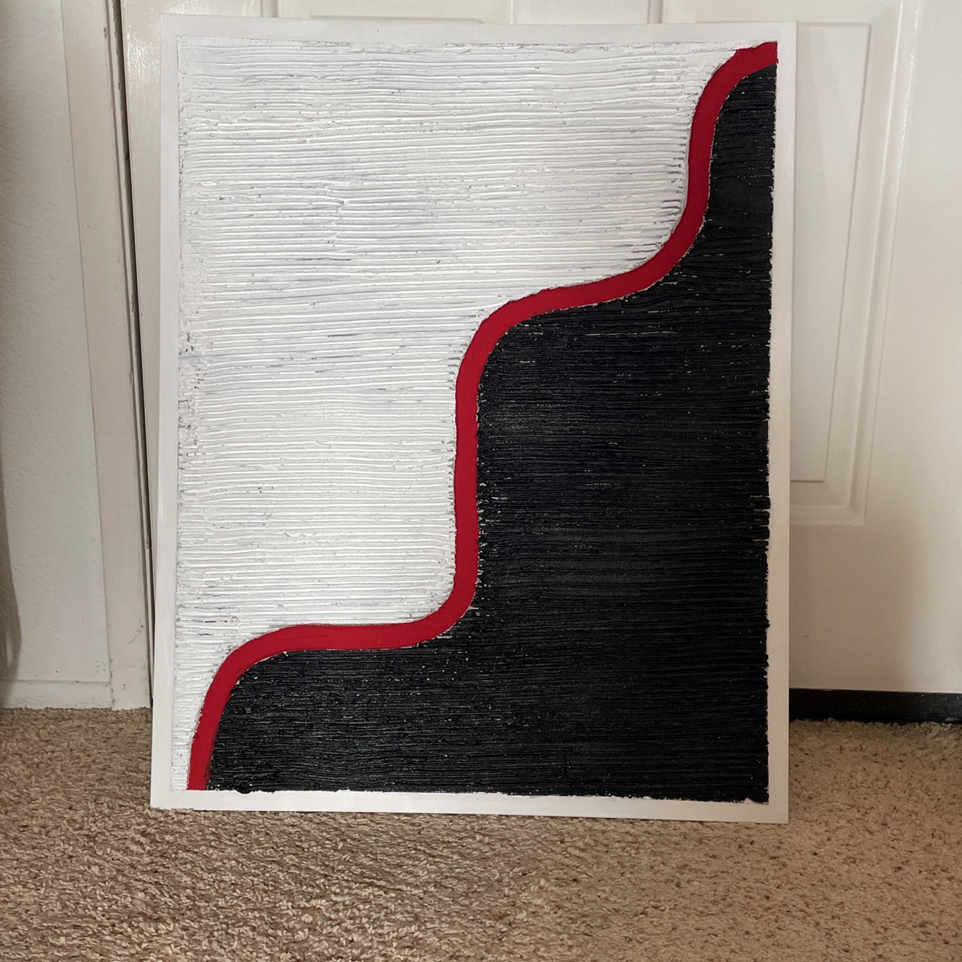 Black and white textured art with a red stripe. Heavy. Firm on prize. See pictures for measurements. Only cash.