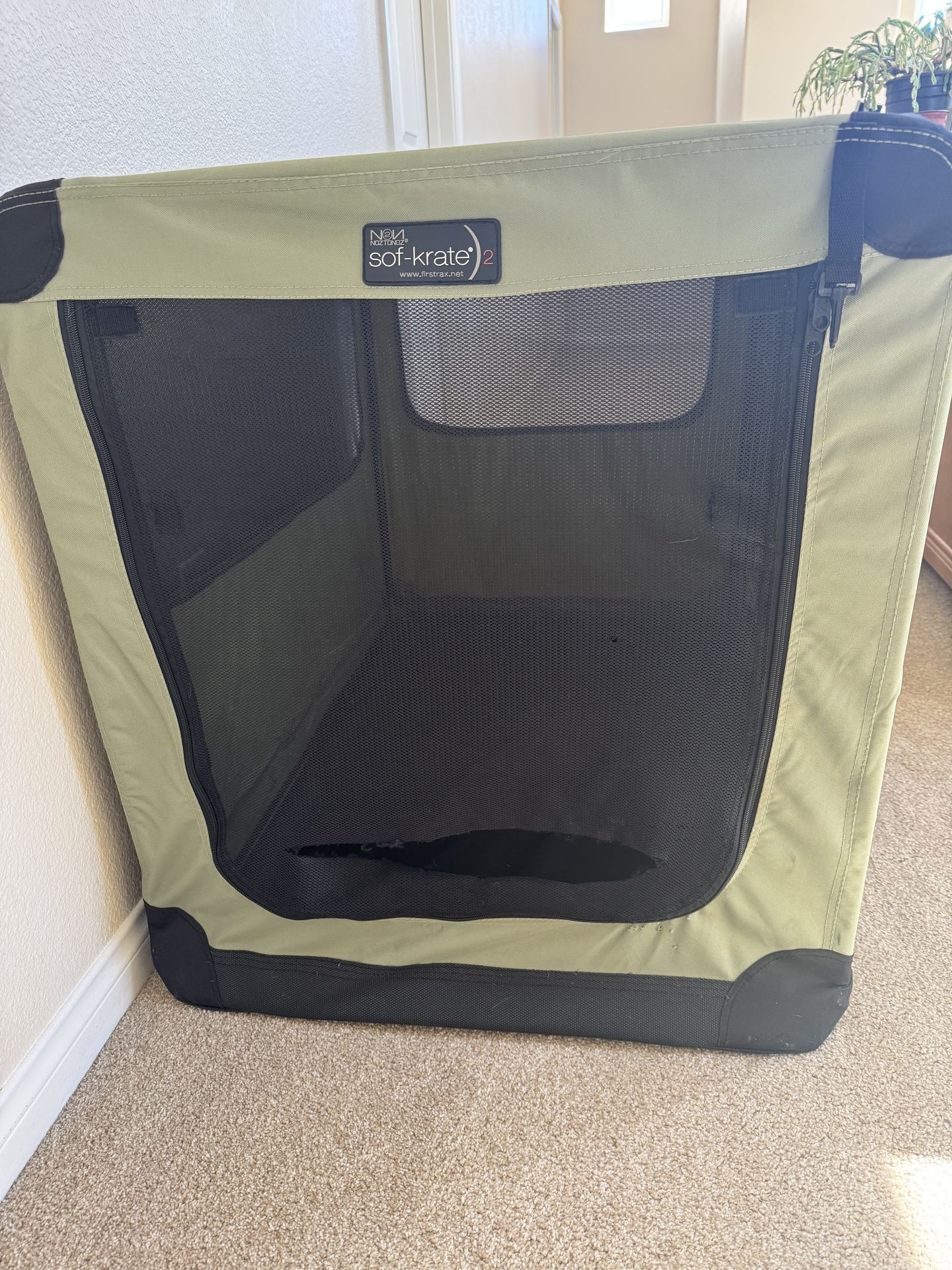 Soft crate, great for travel. In great condition other than the mesh on the front that needs to be replaced. For large dogs, measures 26 inches wide x 42 inches long.