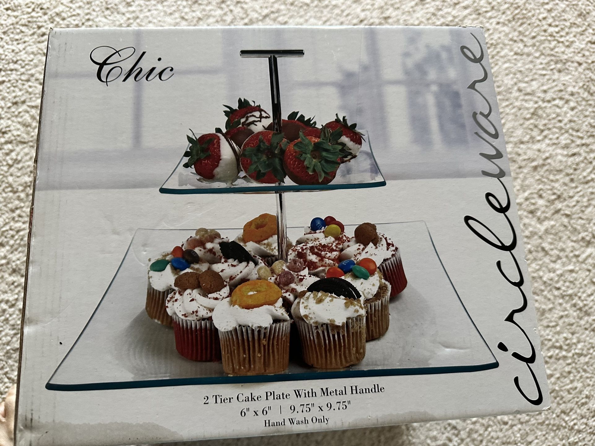 Chic Circle ware 2 Tier square glass Cake Plate. With Matel handle . Plates are 9.75” by 9.75” and 6” by 6”. From a pet and smoke free home.