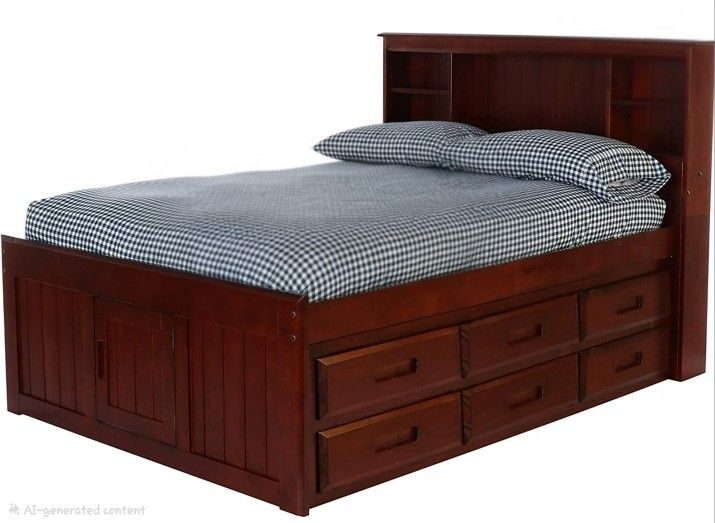 Discovery World Furniture - Full Size Bed Frame with Headboard Bookcase Captain Bed with 6 Drawers, Full Size Bed with Storage, Merlot