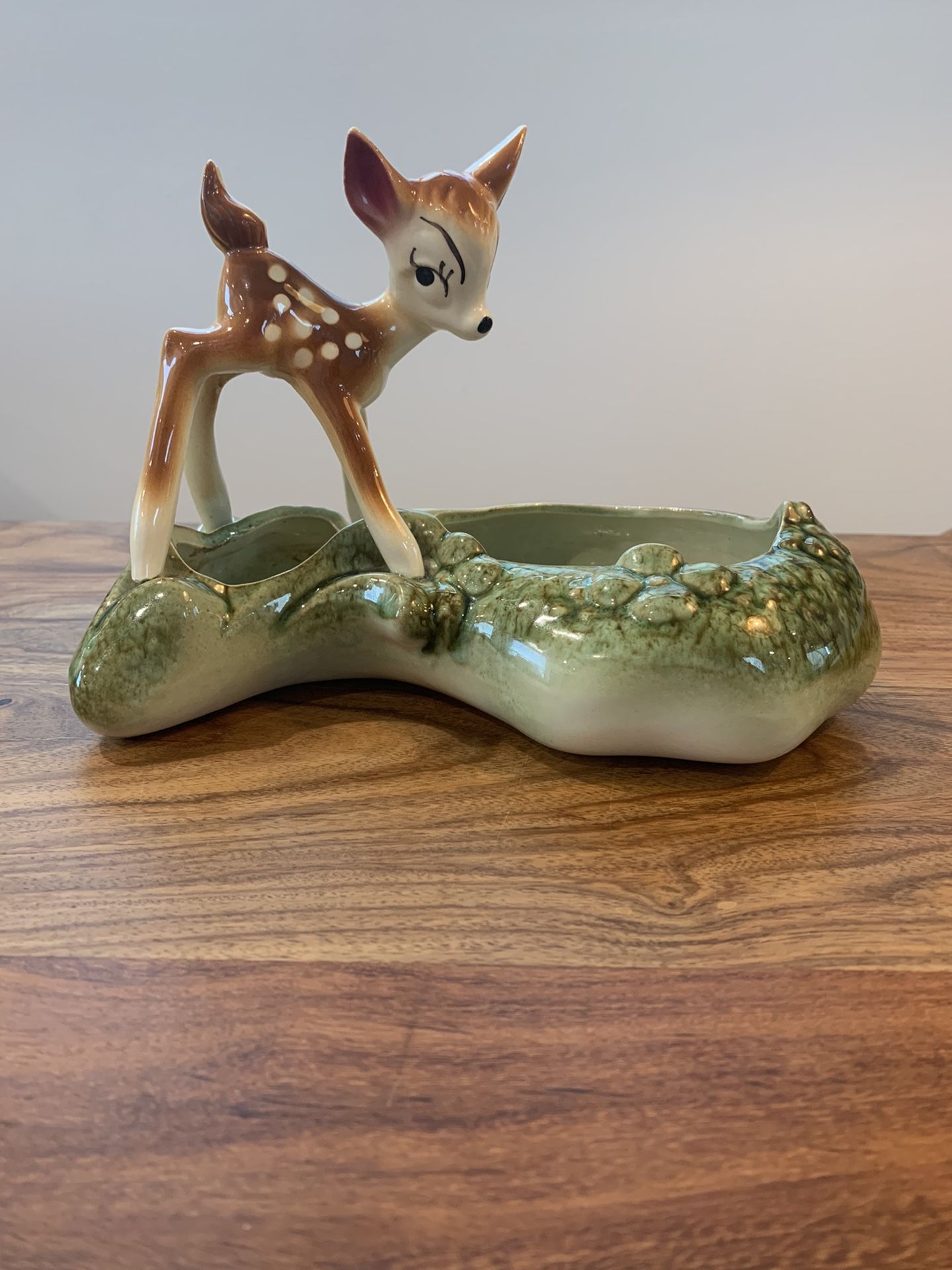 Walt Disney Bambi planter/dish by Leeds China Co. Bright and vibrant, excellent condition. It is marked “Bambi copyright Walt Disney” on the bottom. 9” long by 6.5” tall by 5.5” deep