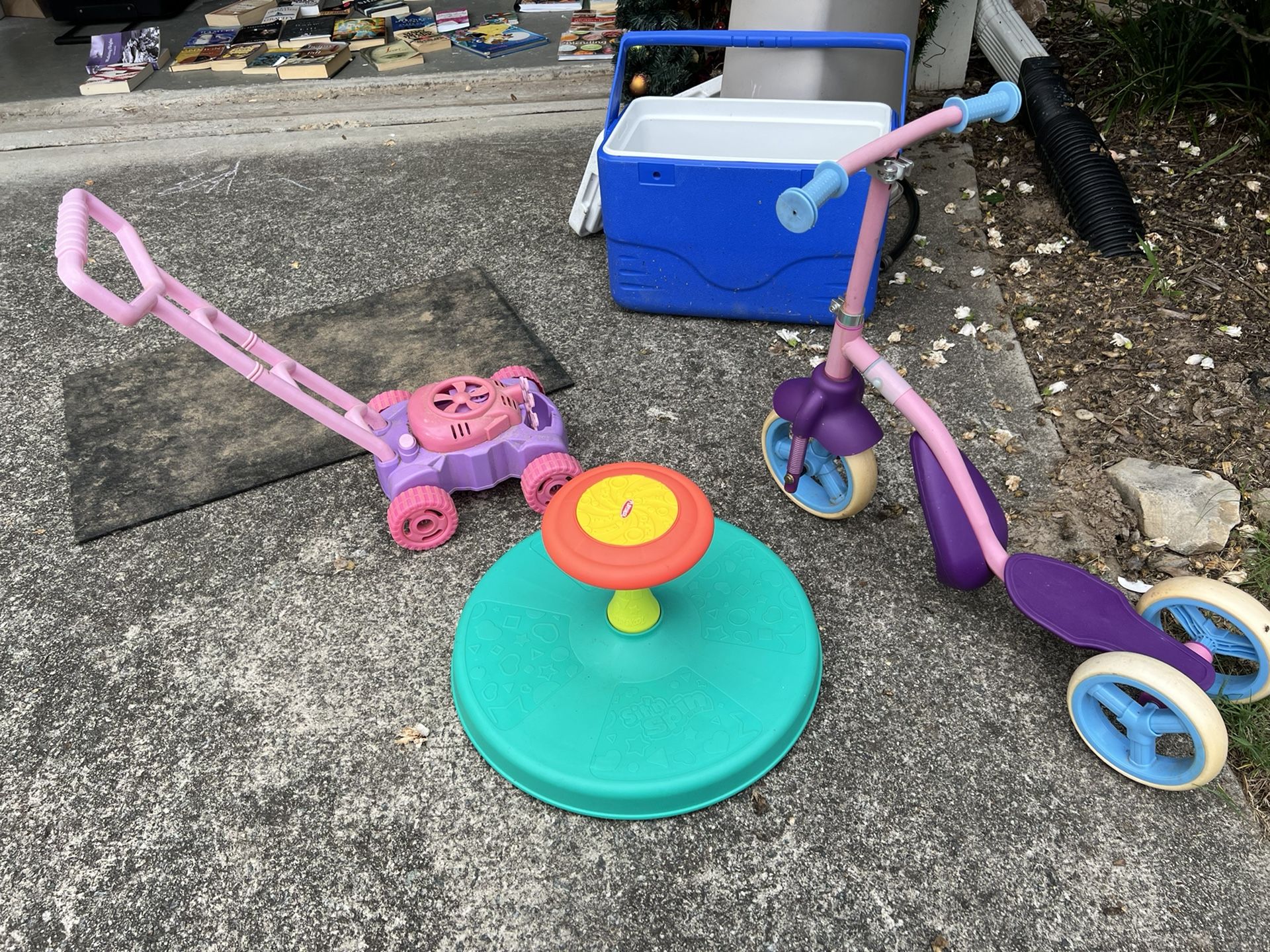 3 Toddler Toys 1. Scooter with two height settings 2. Lawnmower Bubble Blower 3. Sit & Spin toy