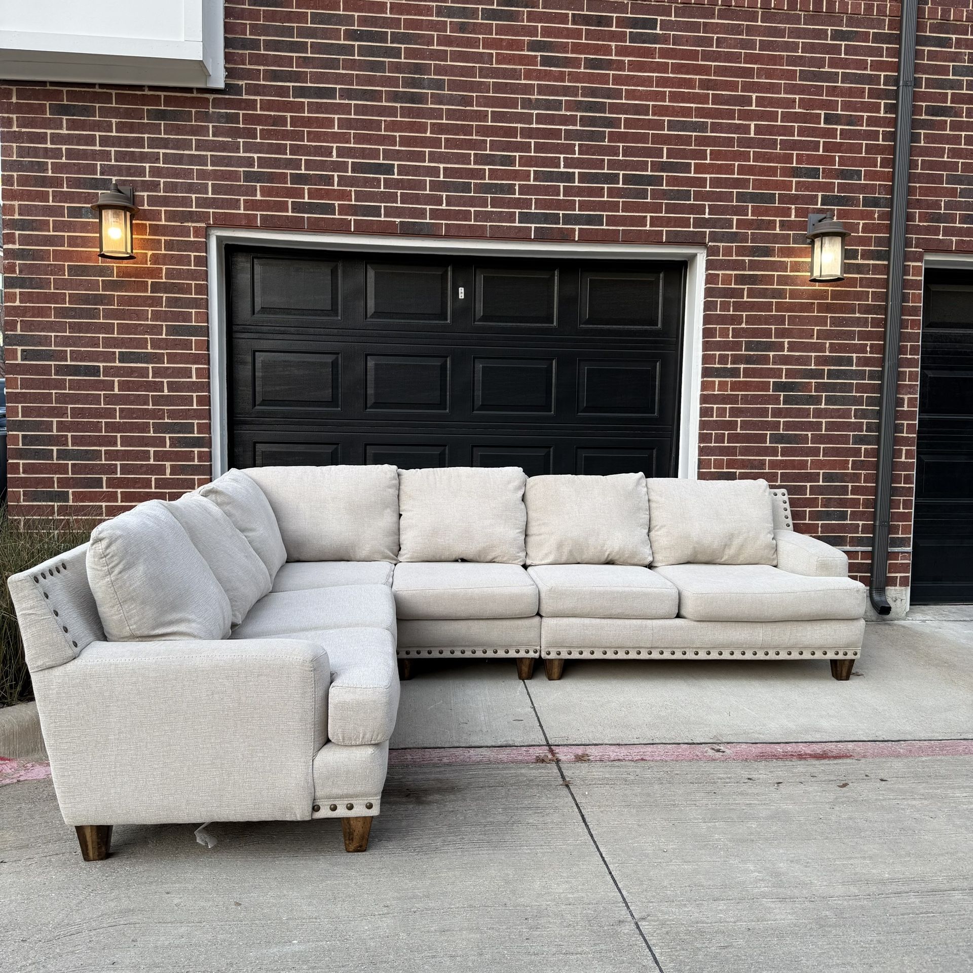 -Off White/Cream 4 Pc Sectional -Interchangeable L Shape (Middle Piece Can Be Added To Either Side To Make Either Side The Longer One) -Rustic/Farmhouse Style W/ Nailhead Accents -Washable Cushion/Pillow Covers ***Has Some Paint Markings - SEE PHOTOS ***One Cushion Has Been Repaired & Sewn -From Small Hole On Both Sides - Worse Side Can Be Face Down - SEE PHOTOS -From Pet Friendly Home -Very Clean! Dimensions As Shown: 98” x 125.5” FREE Pickup From 75069 Delivery Available In Surrounding DFW Area **PLEASE Ensure Proper Measurements Prior To Delivery**
