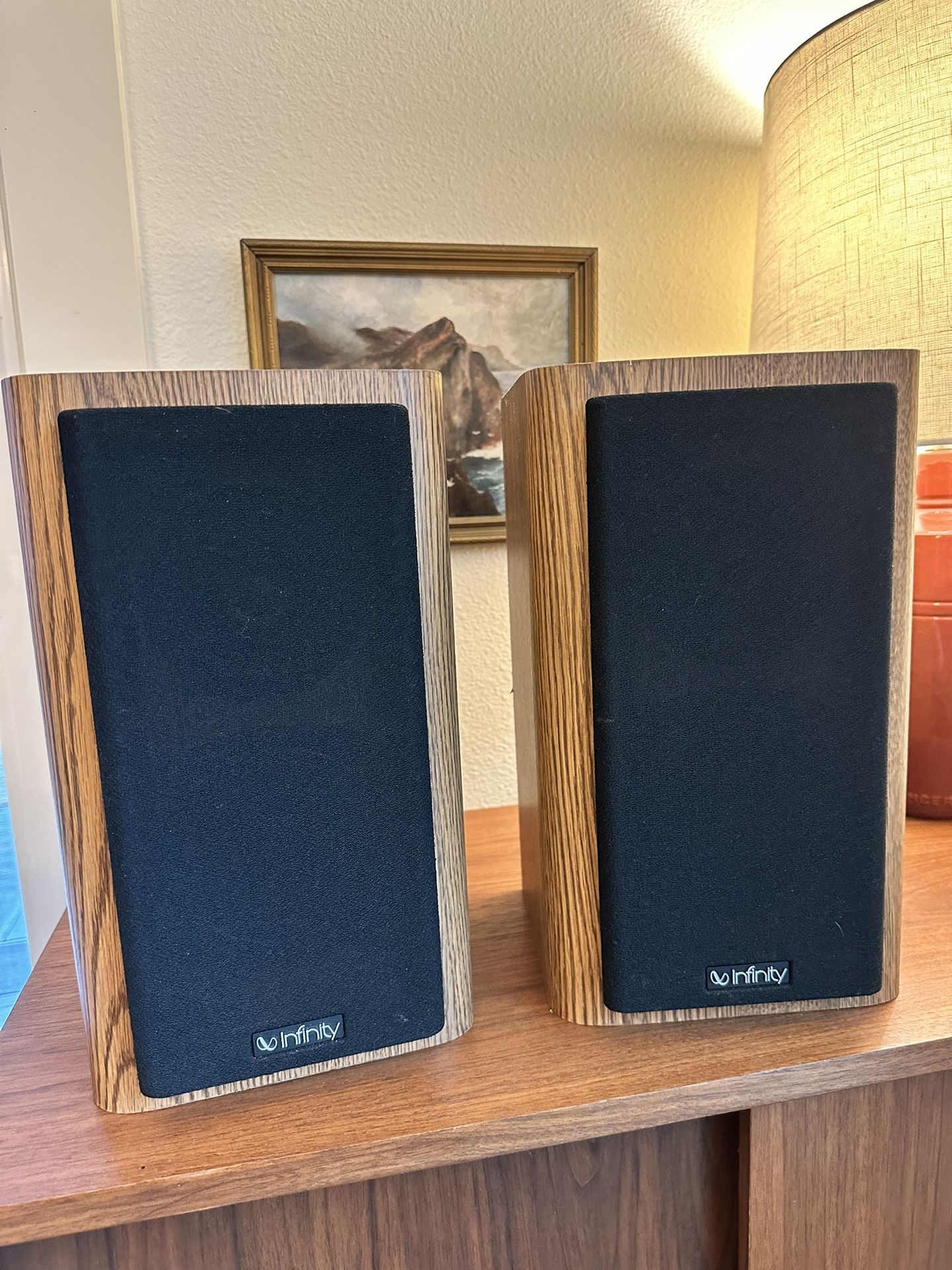 Vintage Infinity bookshelf speakers. Model RS 1000. These speakers sound great. They were refurbished by the previous owner. Wood cases and covers are in great condition. Perfect for any audiophile looking to improve their audio setup or listening room. Dimensions: 12”H x 7.5”W Cash only. . . . . . Keywords: vintage, art, artistic, wood, statue, sculpture, mid century modern, classic, wood, carving, carved, California, beach, seascape, vibe, eclectic, MCM, mid century modern, midcentury, mid mod, mad men, Hollywood Regency, vintage, teak, modern, wood, Danish, Danish Modern, fancy, Palm Springs, Los Angeles, interior design, decor, home design, California, antique, cool, vibe, old fashioned, boho, boho chic, bohemian, Scandinavian, Nordic, walnut, antique, oak, 50s, 60s, 70s, dresser, drawer, chest, cabinet, storage, buffet, sideboard, credenza, lowboy, tallboy, armoire, bedroom, furniture, kitchen, dining set, hutch, china, atomic, futuristic, postmodern, postmodernism, art deco, painting, art, oil, bamboo, rattan, cane, caning, wicker, seascape, bar cart, trolley, records, vinyl, storage, record cabinet, record player
