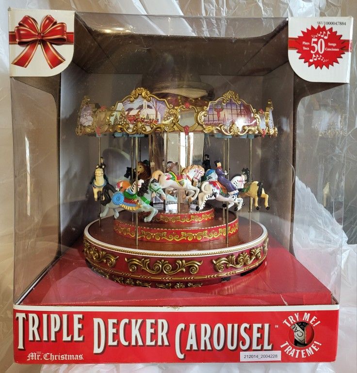 The Mr. Christmas Triple Decker Musical Carousel is a festive and nostalgic collectible perfect for holiday enthusiasts. With 50 songs, lights, and animation, this carousel brings the holiday spirit to life through its colorful and cheerful design. Sure to be a standout piece in any holiday decor collection. I don't believe this has been out of the box, until removing it for testing. Lights, motion and music all working like new. Plug for wall outlet included, there was a non functioning "try me" button that has been removed and disposed of to remove any risk of corrosion from its aging battery pack.