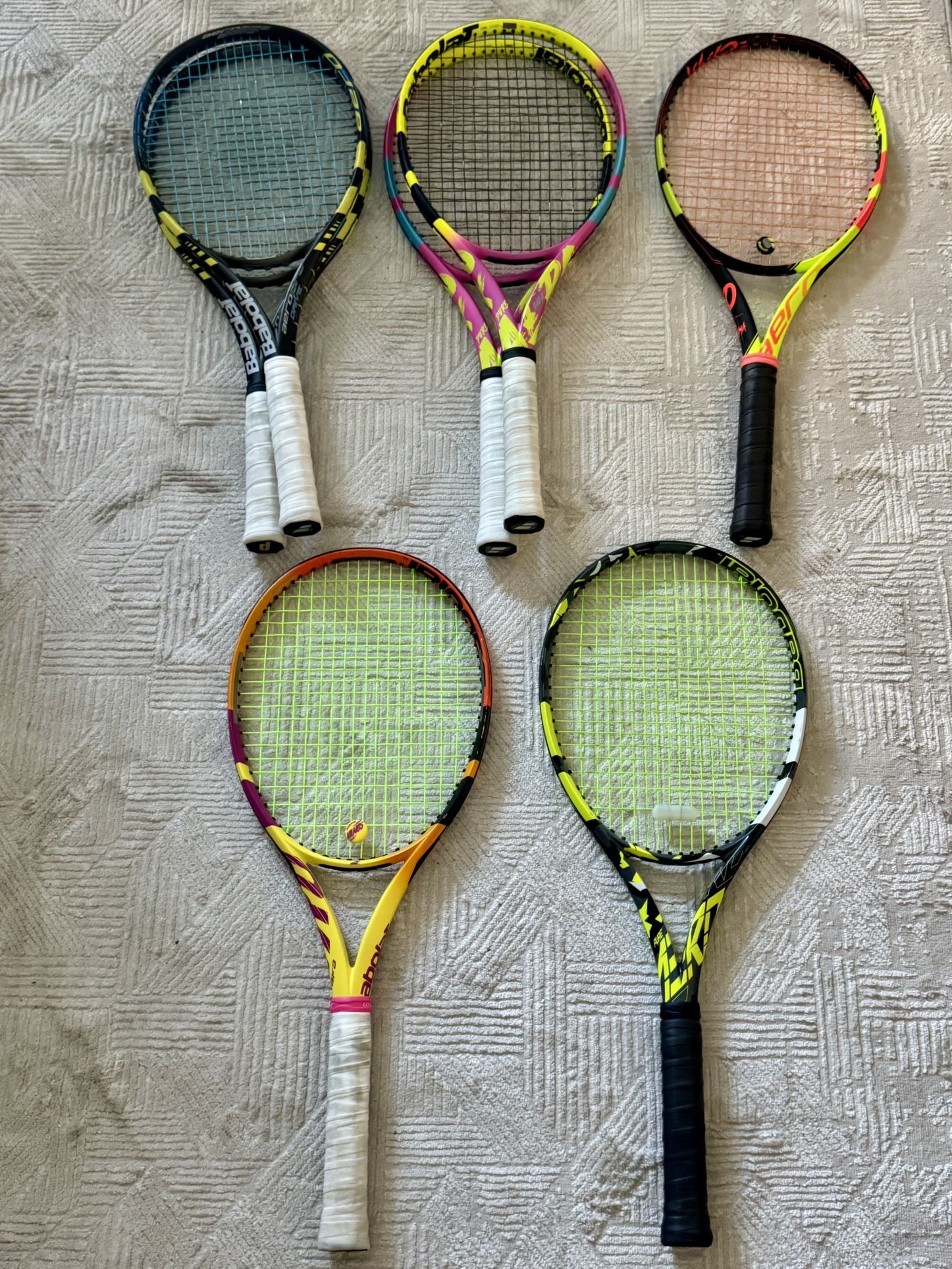 Selling my Babolat Pure Aero collection. Two Babolat Aero Pro Drive (Rafa Nadal Racket) Two Rafa Pure Aero (newest model) One Babolat Pure Aero Rafa 2019 Three Pure Aero “La Décima” special edition One current Pure Aero Message me for prices.