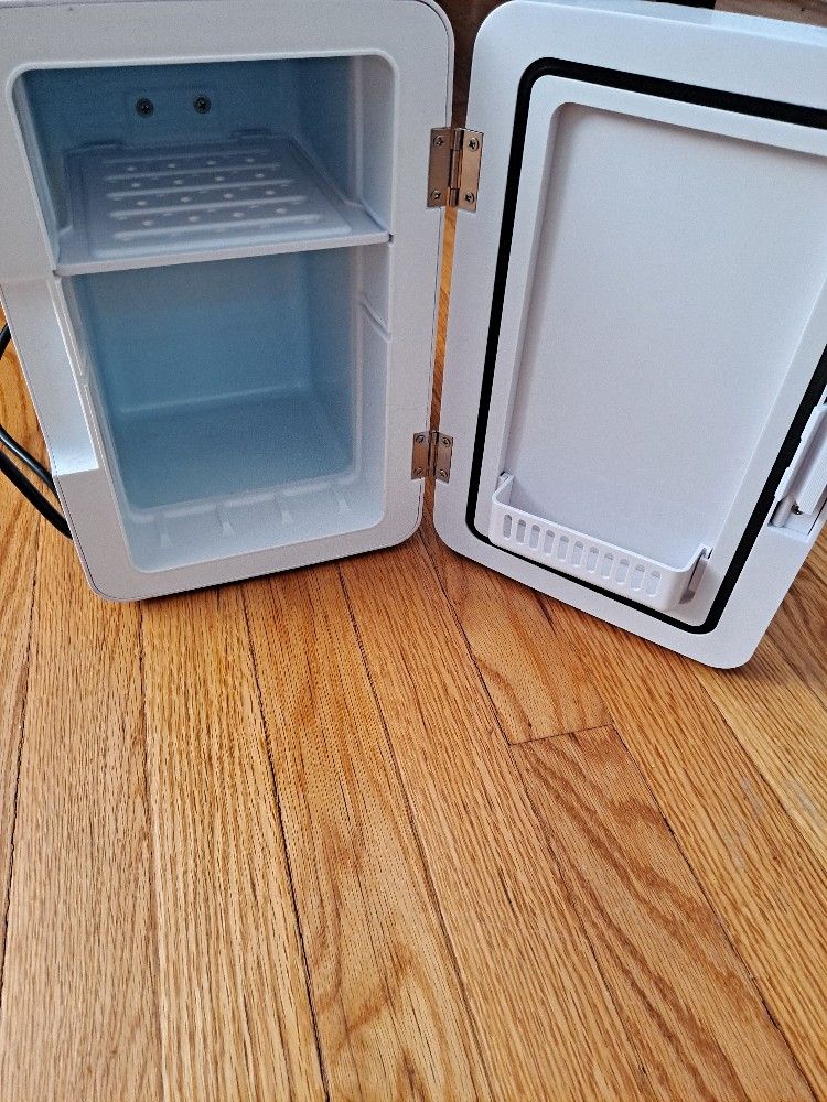 Still brand new Asking 70$ or best offer. HAS 2 different settings: cooling and heating switch Personal chiller LED lighted mini fridge with mirror door refrigerator and heater. White color I have pictures of it being off and also being on with the LED light BRAND NEW!!! I STILL HAVE THE PLASTIC WRAP ON THE MIRROR