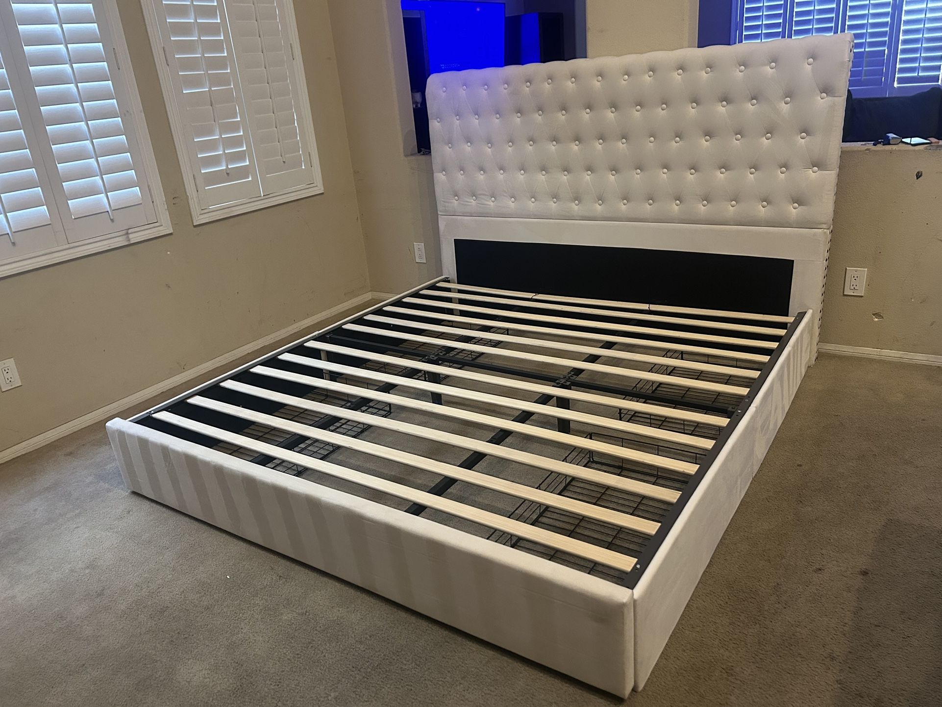 King Size Bed Frame 54" Tall Headboard with Gorgeous Button Tufted and Nail, Velvet Fabric Upholstered Bed Frame includes 4 Under-bed Storage Drawers, Wooden Slats, Noise-Free, white/cream Brand new out of the box and assembled Note missing wheels for drawers but they still hold items. No mattress included. Measurements are in the photos Priced to sale with free delivery. Willing to negotiate price if you want to pick up will need a truck. Will help load her up.