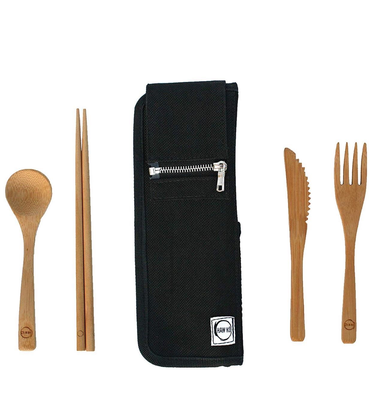 New Bamboo Cutlery Travel Set Utensils | Black Carrying Bag Case Bamboo Spoon Fork Chop Stick Knife Clip | Camping Hiking Outdoors Zero Waste Plastic Free Biodegradable Eco Friendly