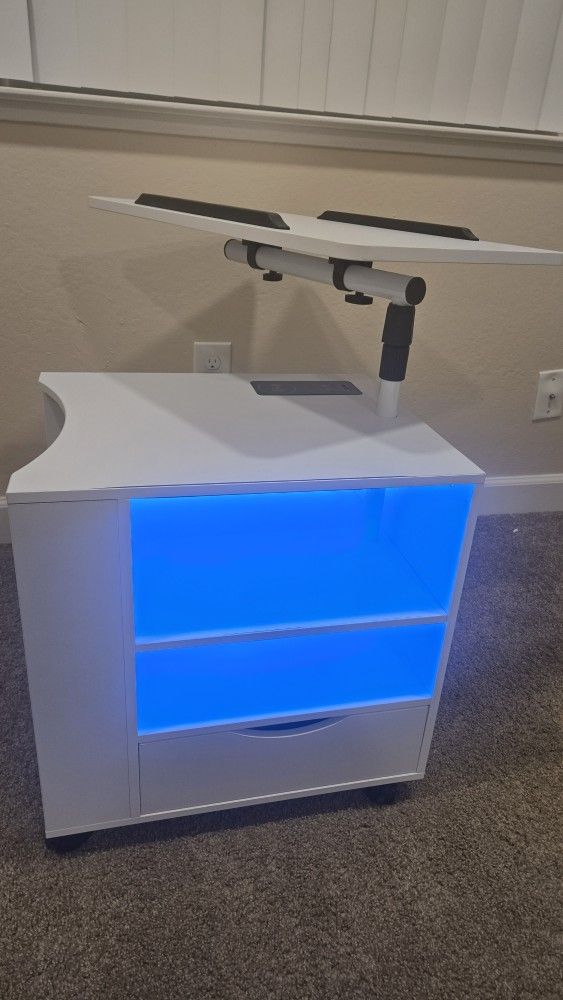 Bed side table in really good condition, has night light and charging pod attached. No pets in the house and gently used for few months 20" wide 30" height(including rotatble top) 16" side length $75 or BO