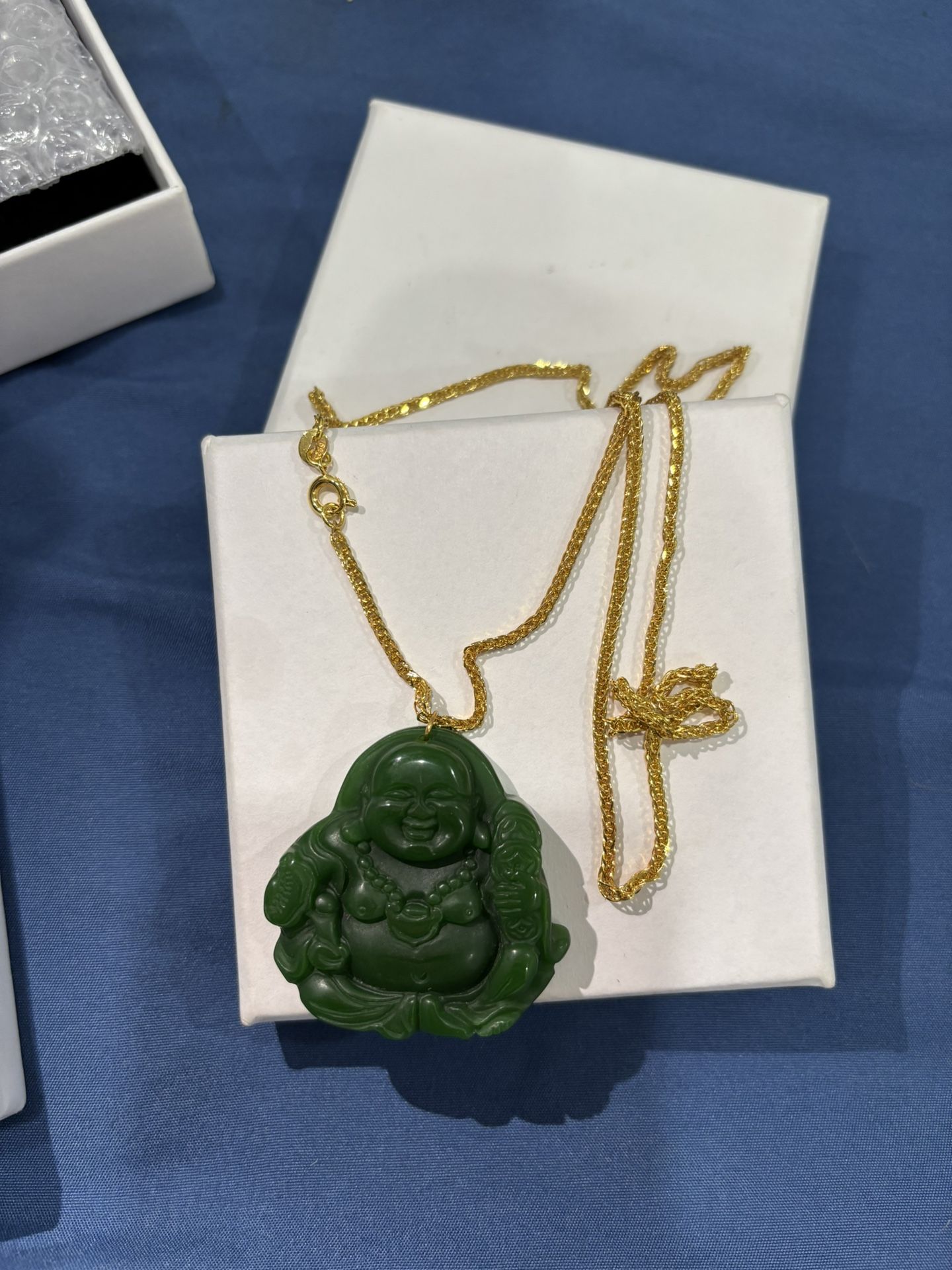 925 Stamped Sterling Silver Franco Chain 28in 3mm Wide Brand New It’s Gold Over Silver With a New Jade Stone Budda Pendant New In Box Nice Gift Asking 925 Sterling Silver Asking 55$