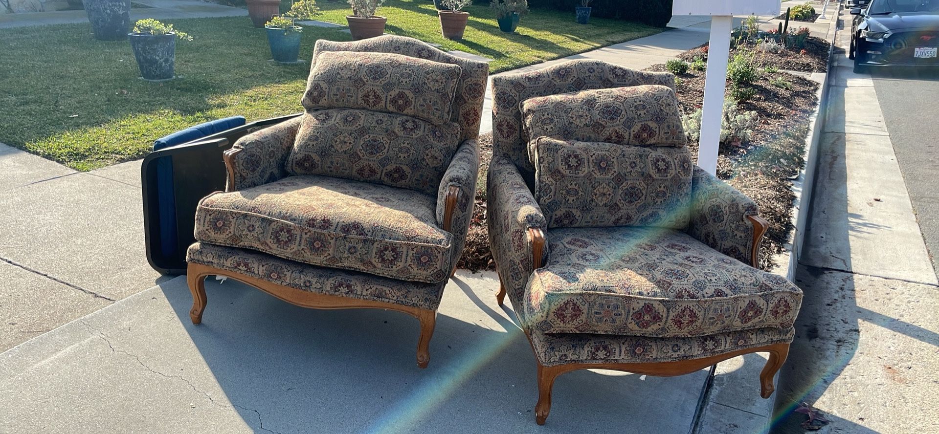 Two large sturdy and comfortable chairs. Chairs are stylish and custom upholstered. Includes matching pillows. We love these chairs but we no longer have the space after upgrading our couch. Additionally: One ottoman from IKEA poang.