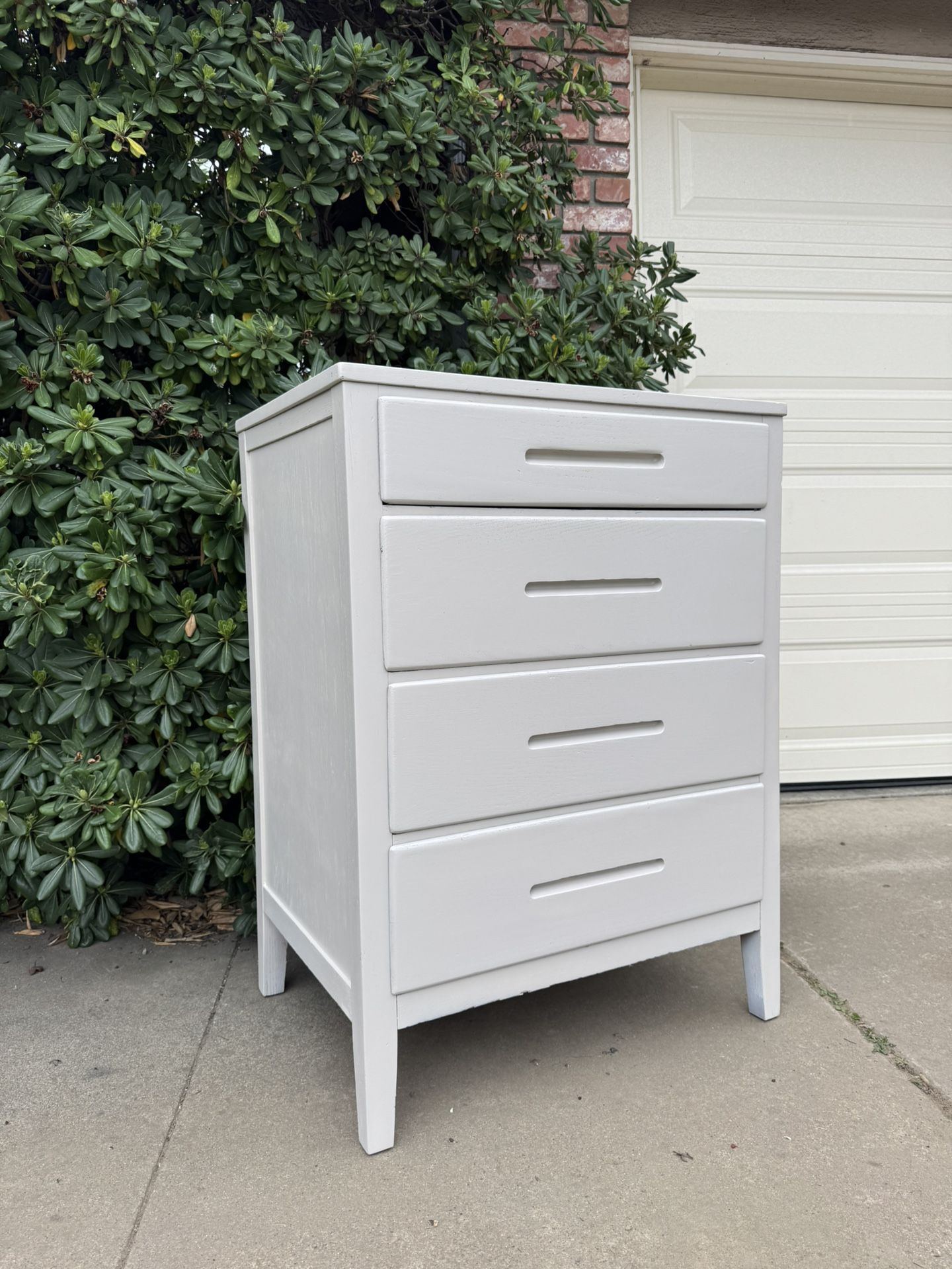 28” length 20” depth 38” height Beige 4-drawer chest featuring a minimalist design with integrated drawer pulls and tapered legs. Modern chests of drawers constructed from solid wood designed to maximize storage in smaller bedroom spaces.