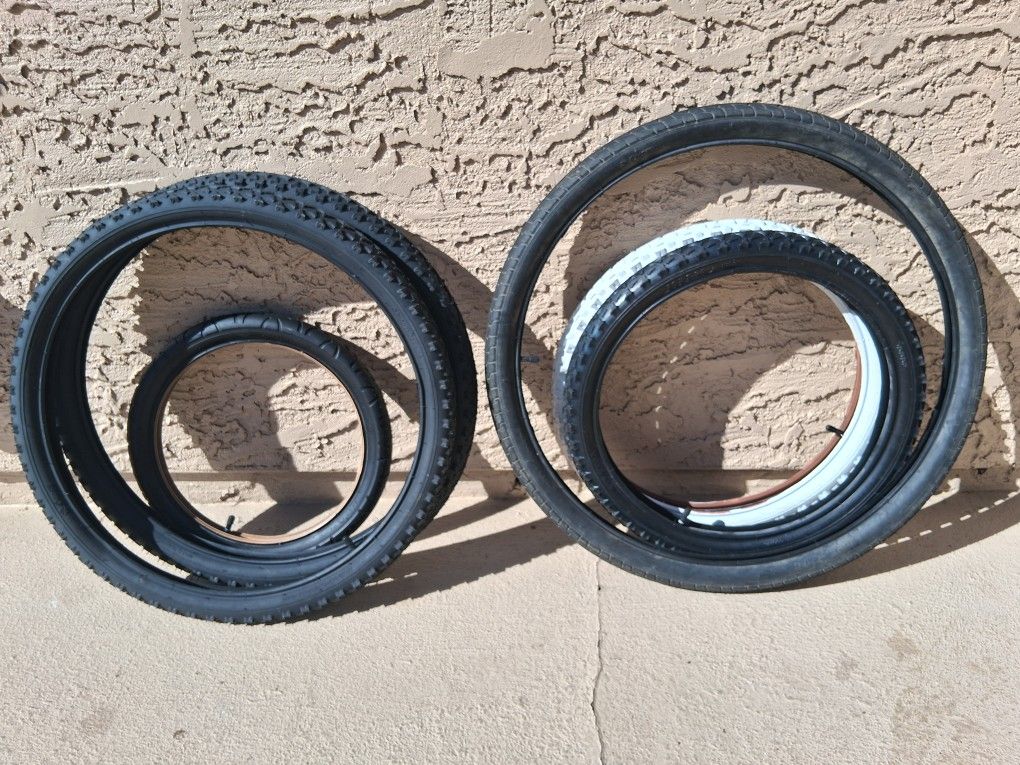 Two New 24" Tires with tubes Two New 20" Tires with tubes One New 27.5" Tireswith tube One New 16" Tire with tube $10 each