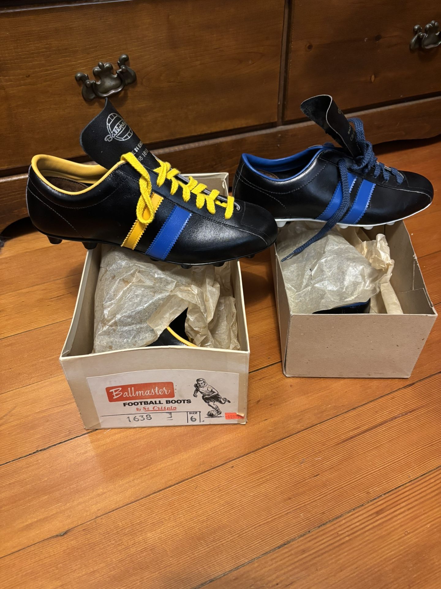Vintage 1970’s Ballmaster football boots by St. Crispin, made in England, new, in original boxes. 32 pairs available in two color options(see photos), ranging in sizes 4 thru 9. $10 per pair.