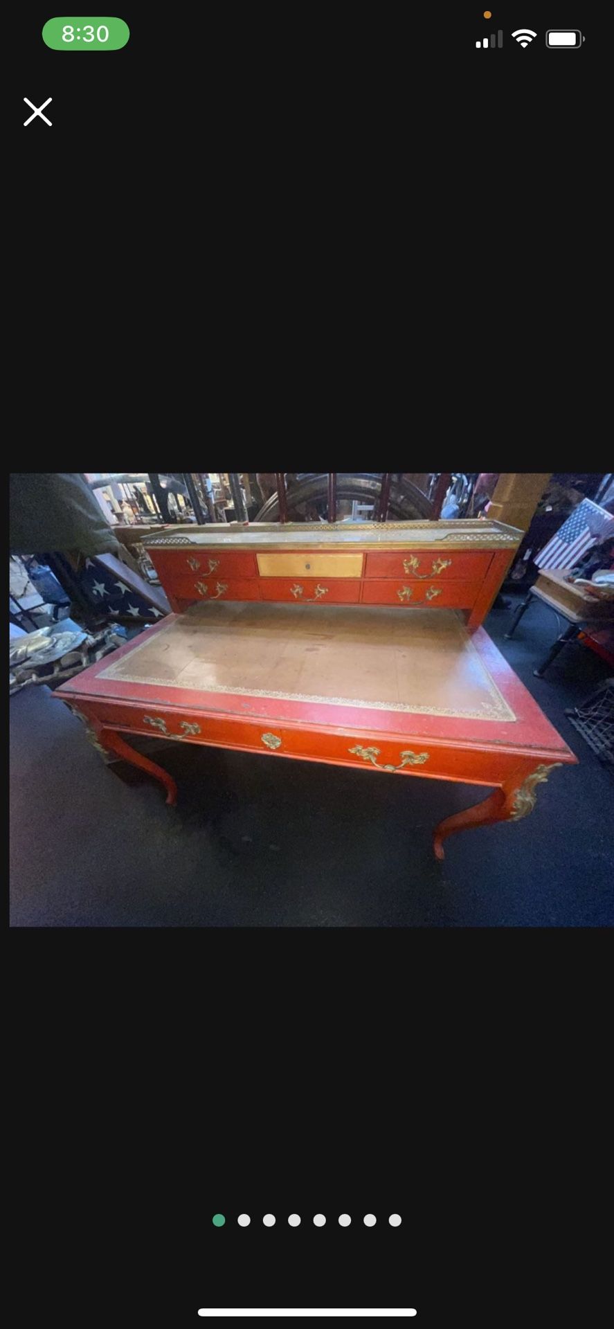 This is an antique french leather inlaid table with matching shelving with marble top, early 20th century Measures approximately 49 inches wide, 30.25 inches deep, 39 1/2 inches tall to the back and 28 1/2 inches tall to the desk top Has some very minor wear from handling and age commensurate with age you can see in the pictures, otherwise in beautiful condition. Please keep in mind that the majority of the items in my store are used, vintage or antique. I try to list every item accurately and to the best of my ability including any damage that I may find. There may be surface wear, scuffing or minor things to items that would come with normal use so if there is something specific you are concerned about please ask. If you see a mistake or flaw in my listing PLEASE let me know! I try to research each item and now and then I get it wrong. I welcome input and will make changes when I can verify your input. I have an antique & vintage shop in San Diego close to downtown with a wide range of antiques, furniture, collectibles and other unique items. Open to the public by “appointment” usually starting in the afternoons every day.