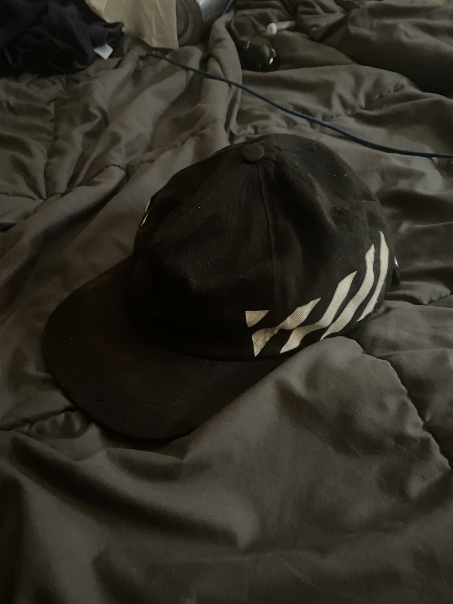 OG Black Off white hat with traditional lines along both sides Some show of wear on the strap but other than that great condition (No sweat stains, scuffs, rips, etc. )