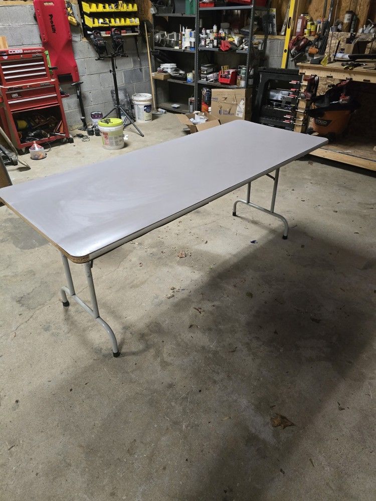 6ft laminate table with metal legs Table is sturdy but has edge that is worn out
