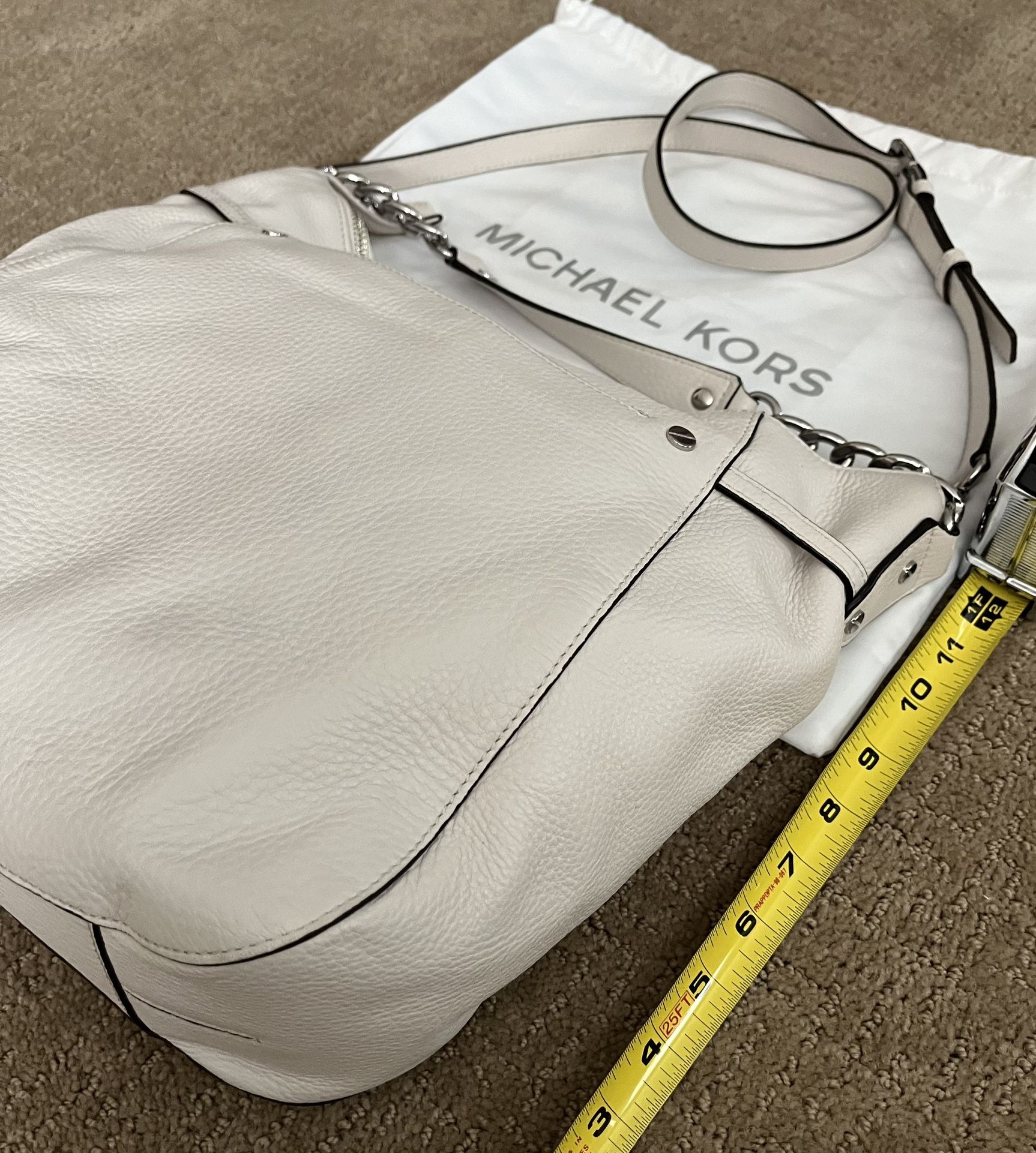 Michael Kors White Pebbled Leather with Chrome Accents Tote Top zip Both shoulder strap and hand strap Outside magnetic pocket 4 inside pouches 1 inside zipper pouch Approximately 12“ x 12“ dimensions Like new!
