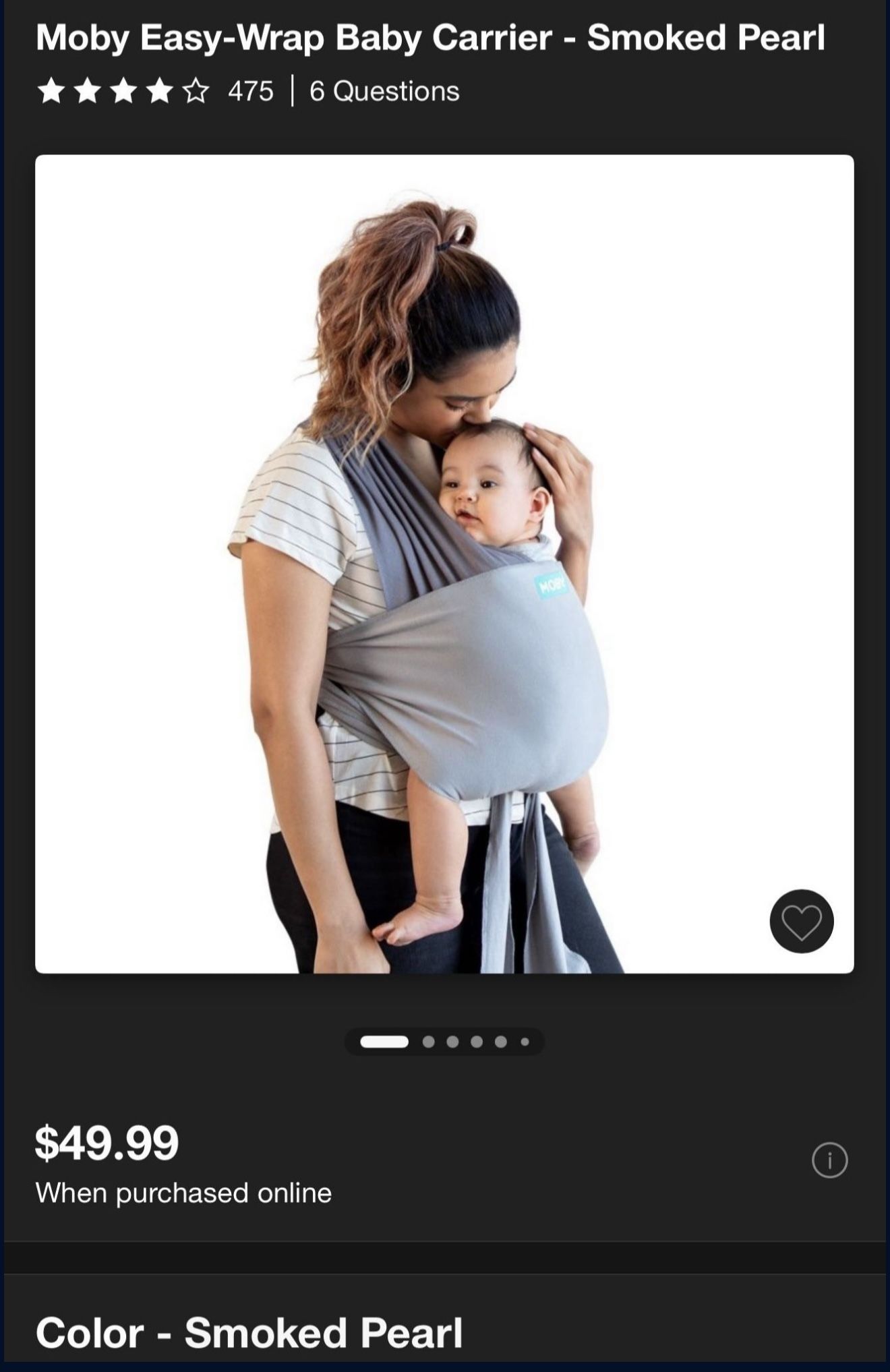 *NEW CLEAN NON SMOKING PET FREE HOME* Moby Easy-Wrap Baby Carrier in COLOR Smoked Pearl. Very easy to use. Wears like a T-shirt. Retails for $49.99