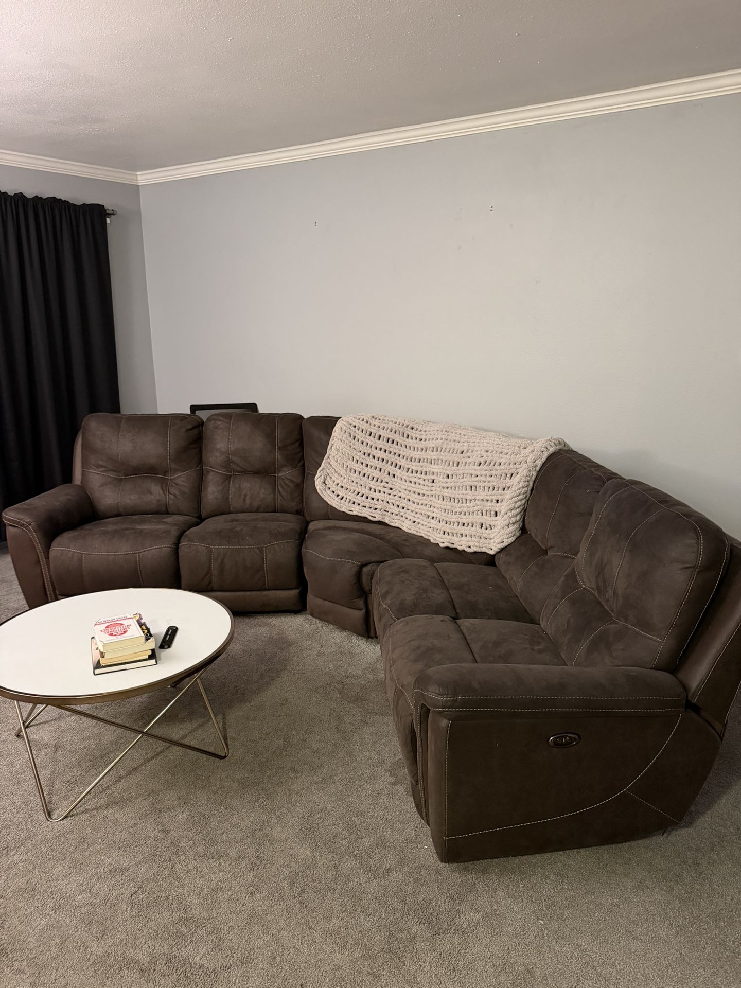 5 seat Brown Sectional couch in good condition bought from Living Spaces - Ends do not recline, the electrical cord is broken. May be able to replace/fix - must pick up