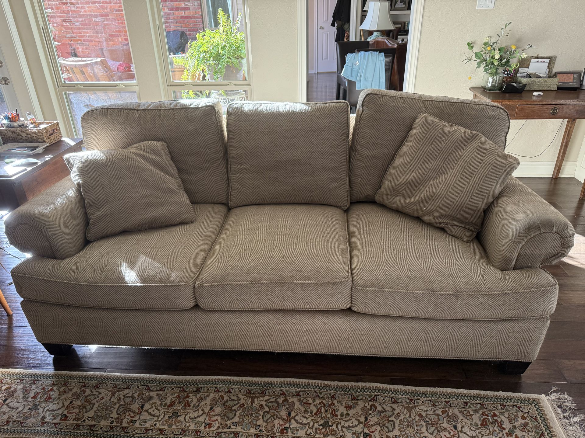 A high end brand by Sherrill: the sofa is in tones of beige and cream with a hardwood frame and 8 way hand tied structure. The sofa has 3 back and 3 seat loose cushions that are reversible and has rolled arms. Length: 80” Depth: 41” and 38” seat depth Height of back frame: 34” Height of seating area: 18” Owned in home without animals or children and in very good condition. Cash only; pickup only