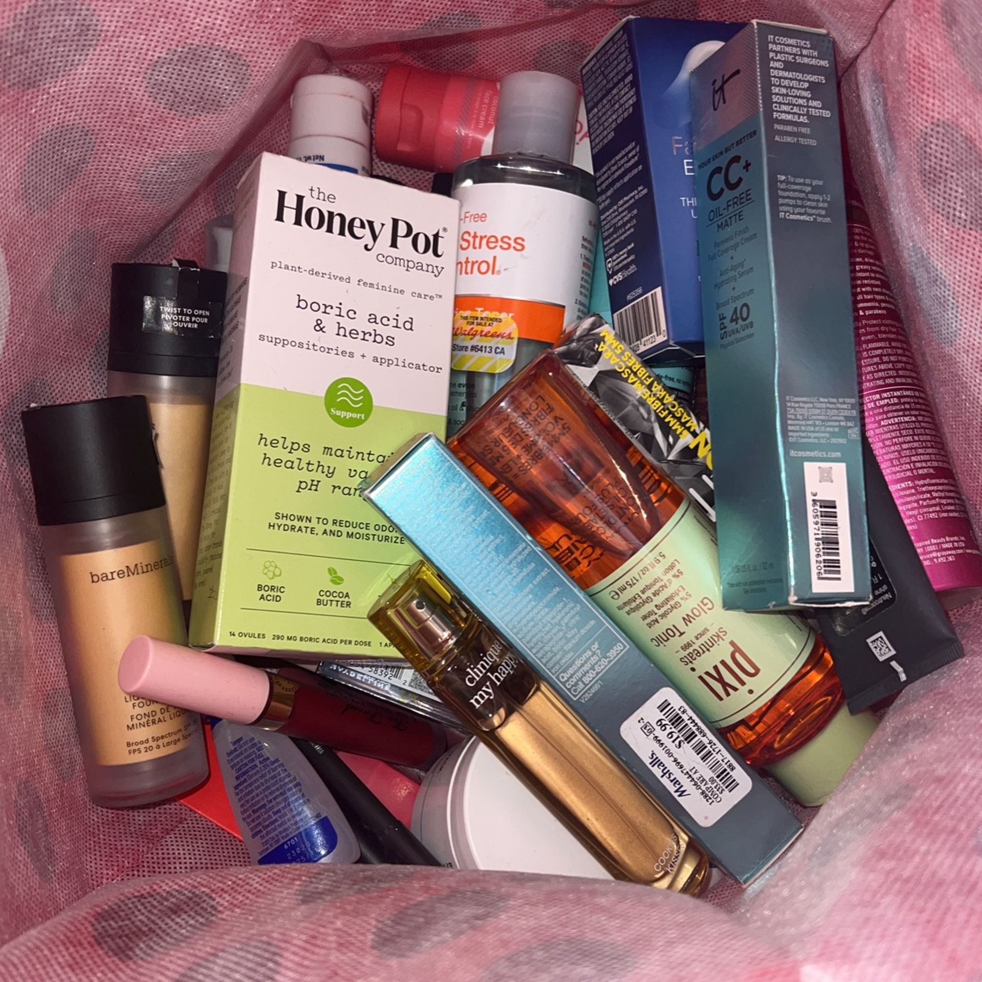 Hi, I’m selling a medium size box full of brand new items.. (Ex. Face lotion, liquid foundation, mascara, Lashes, lash glue, lash tools, facemasks under eye, masks, acne treatment, nail polish, foot mask…) This box contains different brands like… MAC Too Faced BAREMINERALS IT COSMETICS PIXI Neutrogena Loreal Kopari Milani PanOxyn Essie The CRÈME Maybelline imPRESS I also have tons of other items, not pictured here if interested send me a message and I can also show you other items which are higher end name brand items.