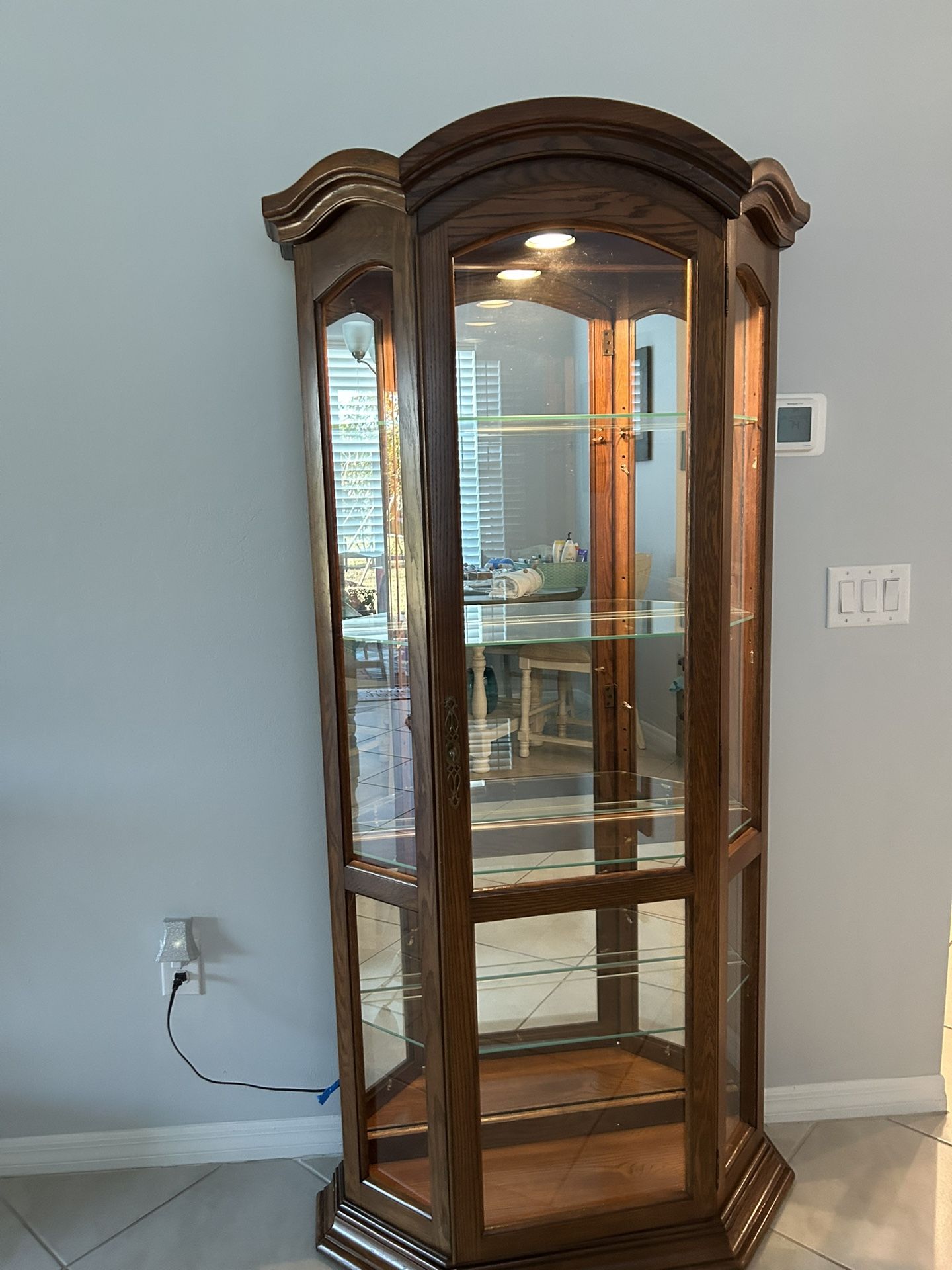 Solid Oak Curio no pressed wood has glass shelves lights up on inside, is medium oak color, very good condition, size is 33 1/2 W x 76 H x 12 D absolutely beautiful piece, unfortunately will not fit in my new home. Asking $200.00. They don’t make them like this anymore.